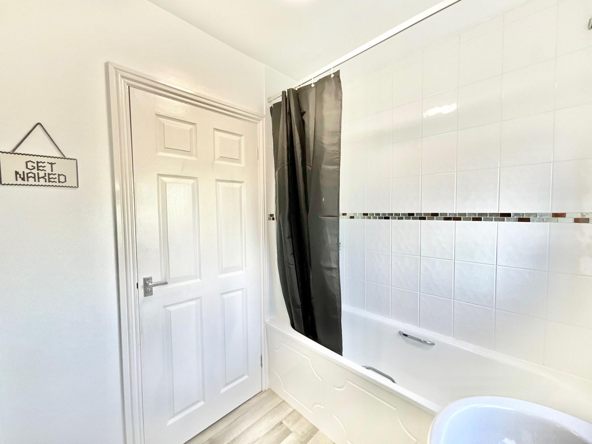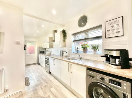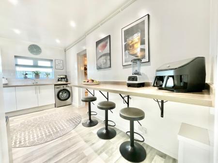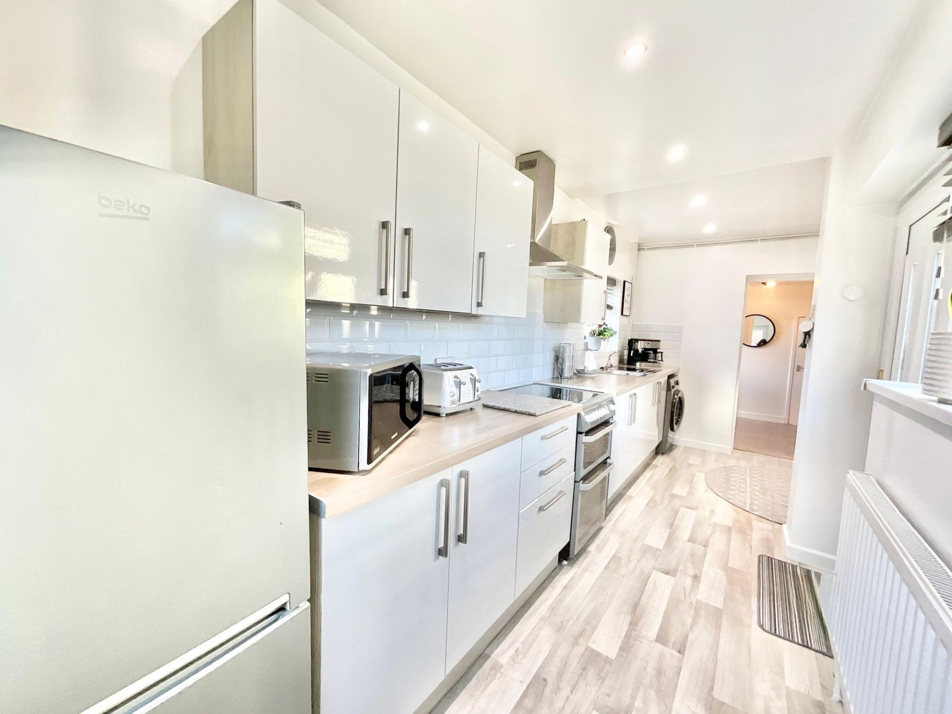 - The kitchen is newly updated with white sleek cabinets, topped with a wood effect work top, sporting a breakfast table for those morning coffees and croissants.