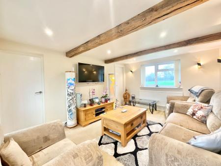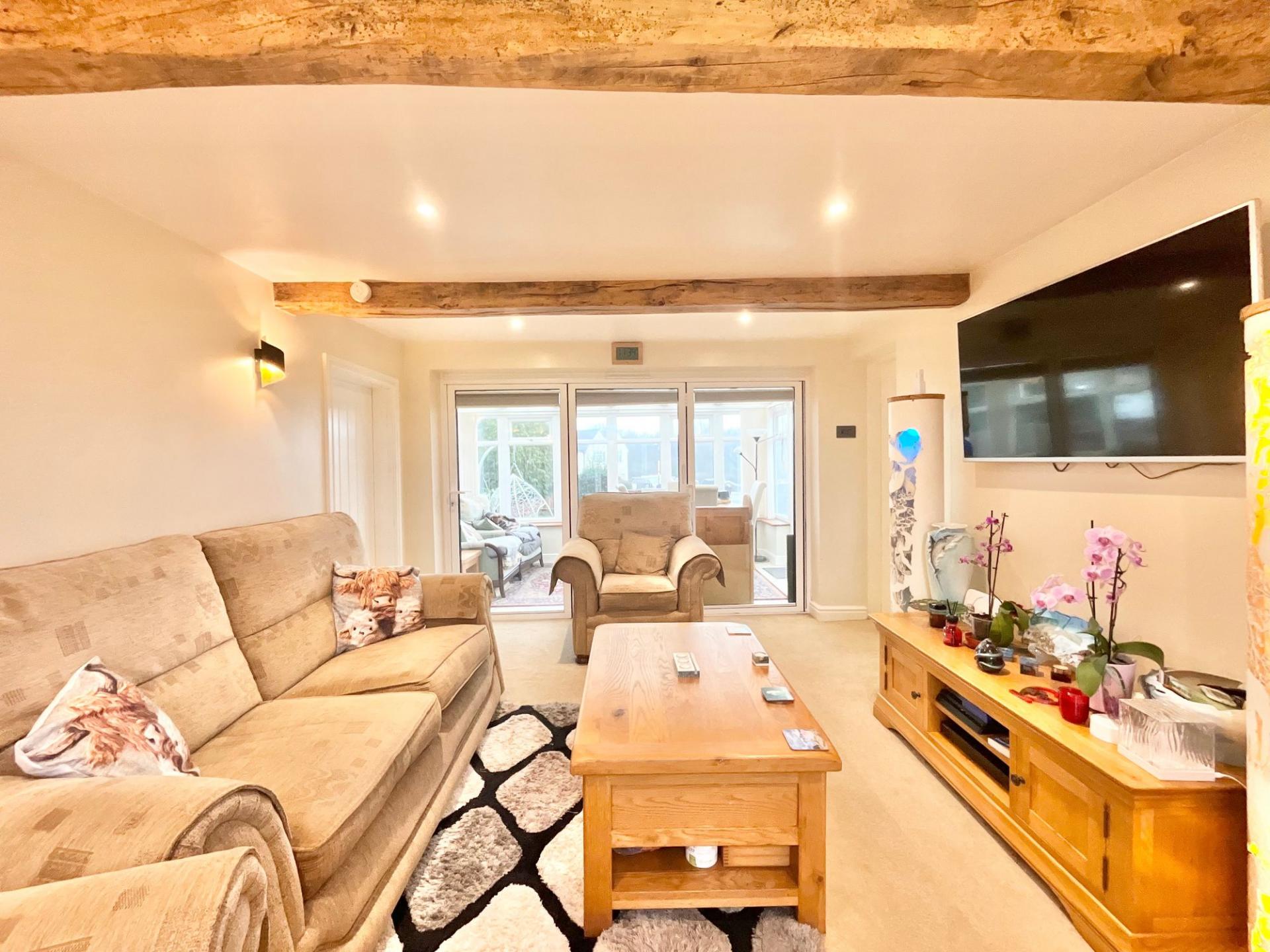 - Cosy meets stylish indoors – A welcoming reception hall and a character-filled lounge with beams, spotlights, and garden views through trifold doors.
