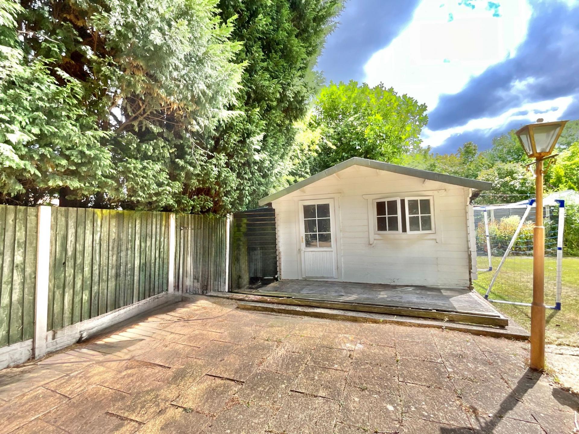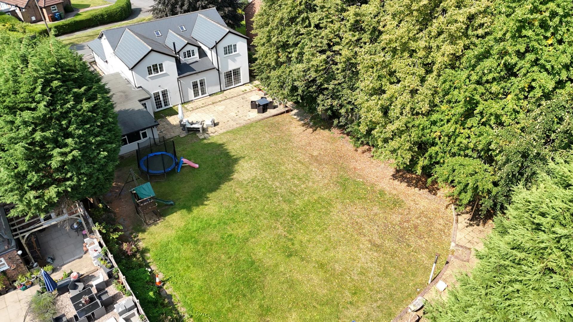 - Expansive rear garden with patio, lawn, mature trees, summer house, plus large gated driveway, detached garage, and outbuilding with power.