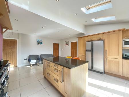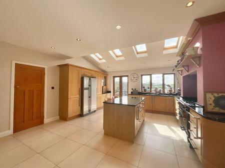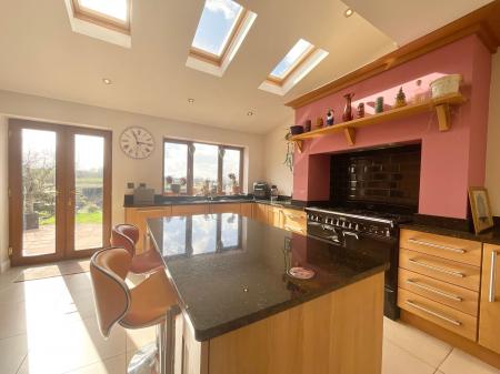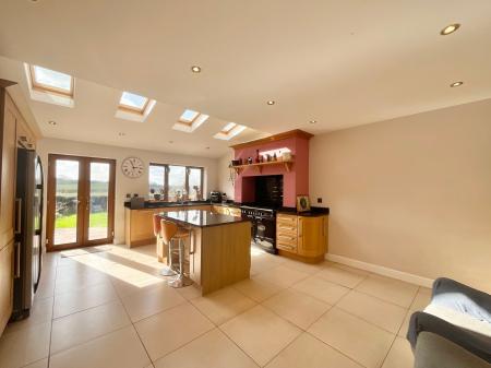 - Spacious living room with skylights and bifold doors opening onto the garden.