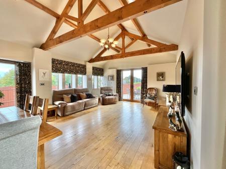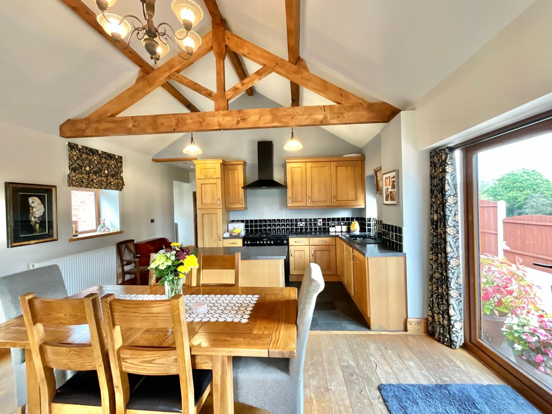 - Individually designed barn conversion with vaulted ceilings, exposed pine beams, arched windows, and oak flooring, blending character with comfort.