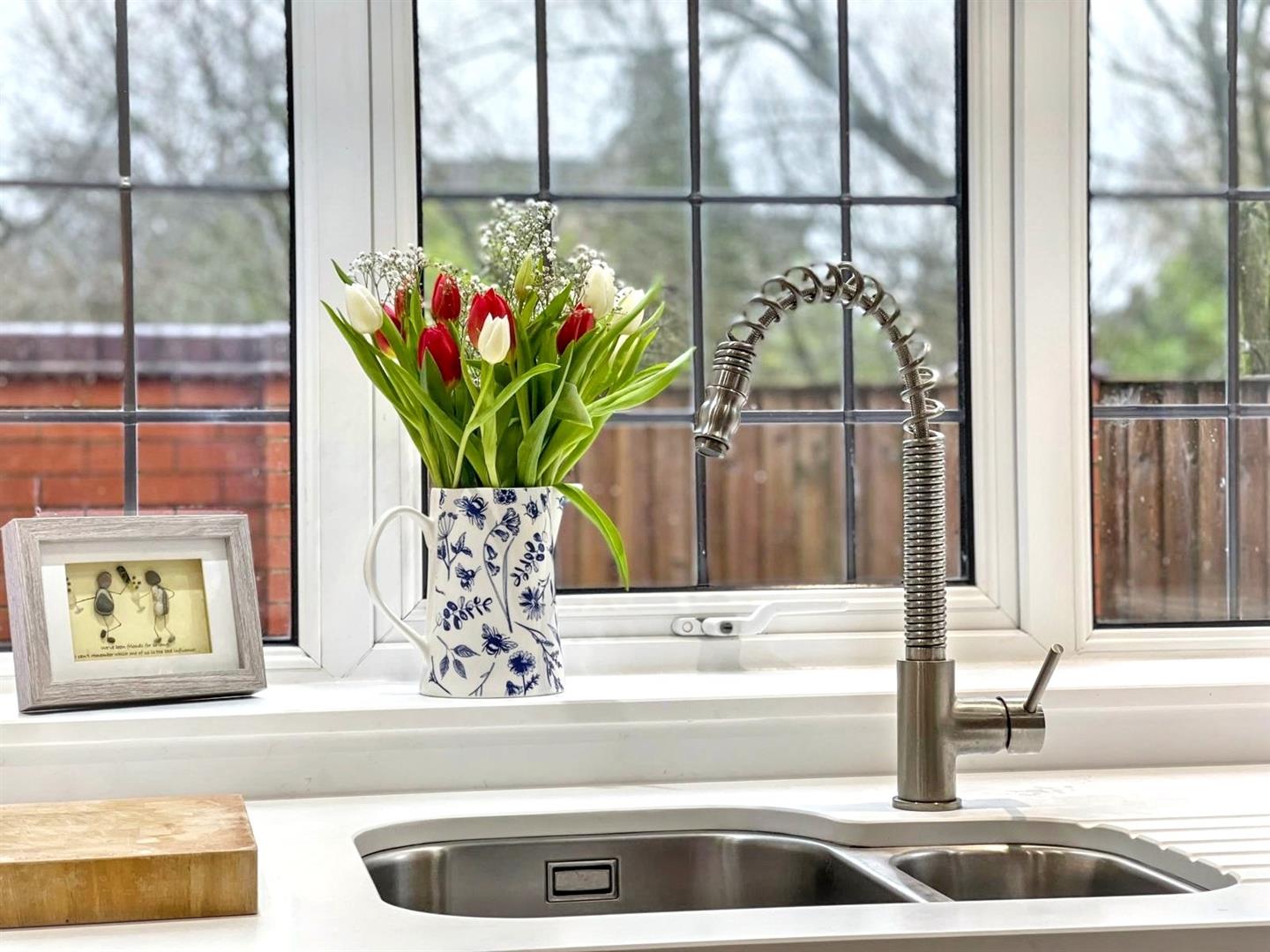 - Stylish updated shaker-style kitchen with quartz worktops, integrated appliances and pantry cupboard