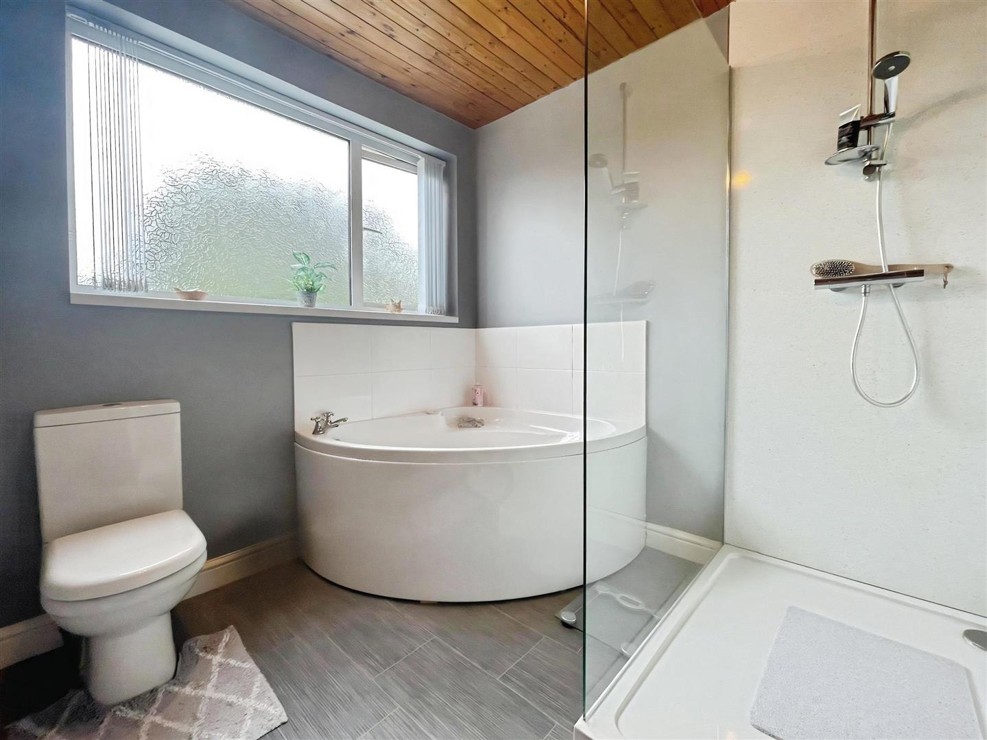 Bathroom - 2.36. x 2.44 (7'8". x 8'0" ) - Vinyl flooring. Wall mounted towel rail. Walk-in shower. Corner bath. Low-level WC. Wash hand basin with storage underneath. Obscured UPVC double glazed window to the rear aspect. Ceiling light.