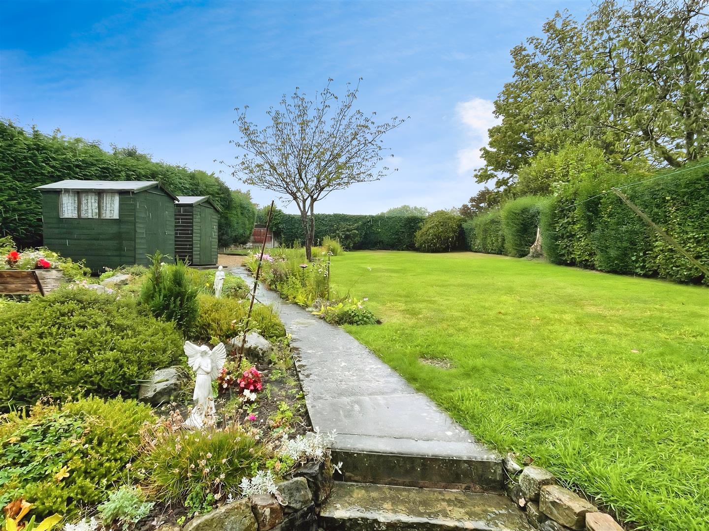 Externally, this home truly excels. A gravelled driveway provides ample off-road parking and leads to a detached single garage. There is side access on both sides of the property, opening onto a large, beautifully maintained rear garden with open possibilities. The garden features an initial paved patio area, a central pathway, and expansive lawns with well-stocked borders. To the rear of the garden is a further paved area housing two useful storage sheds, all framed by a mature surrounding hedgerow offering privacy and a tranquil setting.