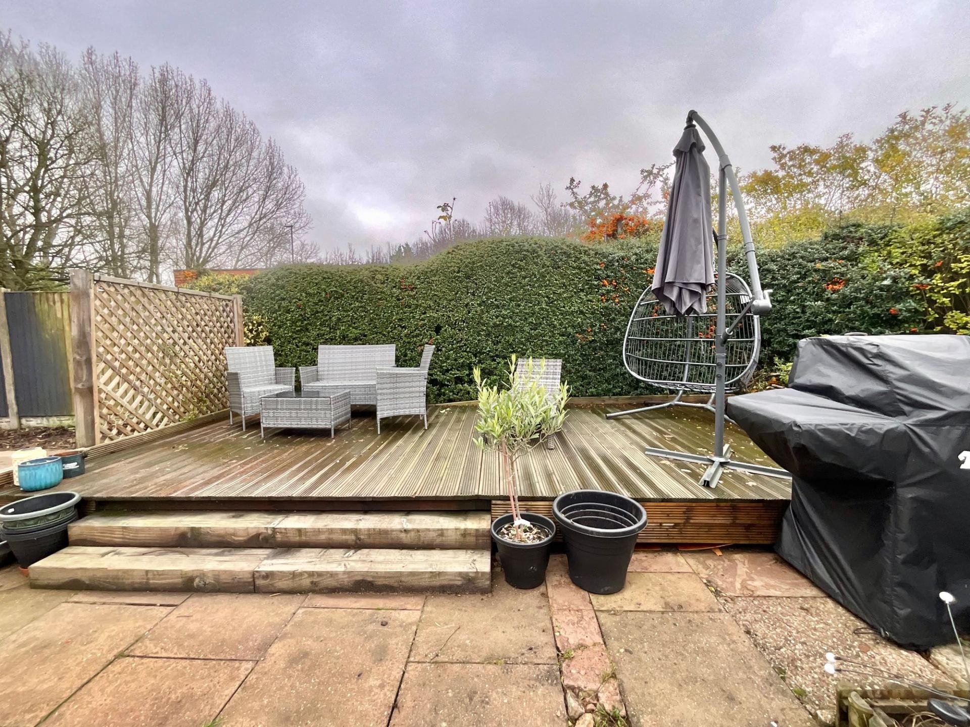 - South Facing garden, featuring lush green lawn, patio and decking with fluffy green hedges offering privacy and fences to the side.