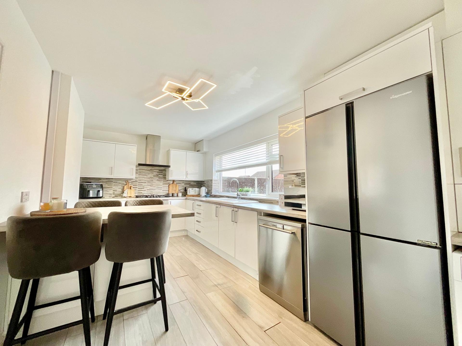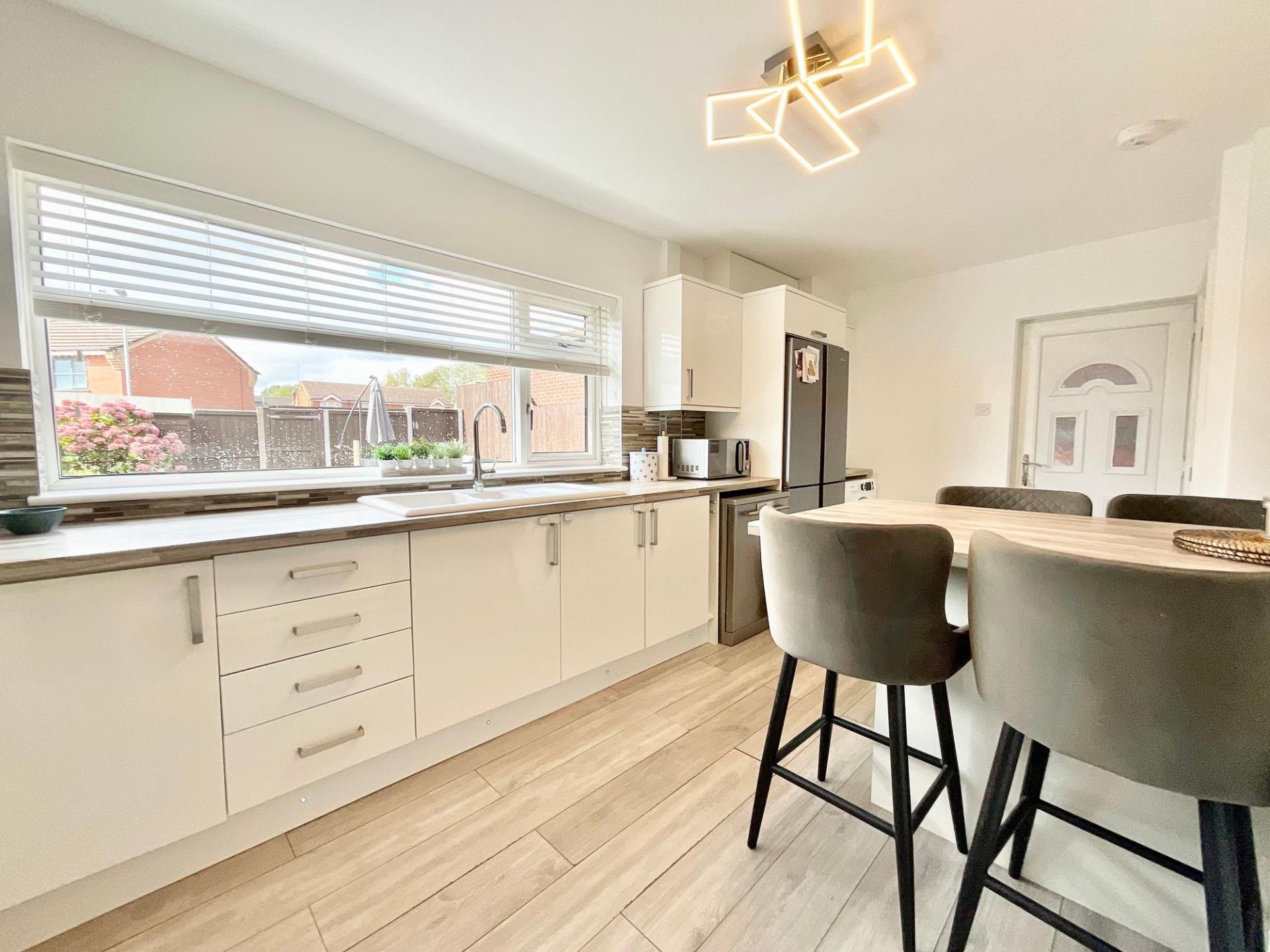 - The sleek kitchen-diner, complete with island bar and garden views, is the perfect heart of the home.