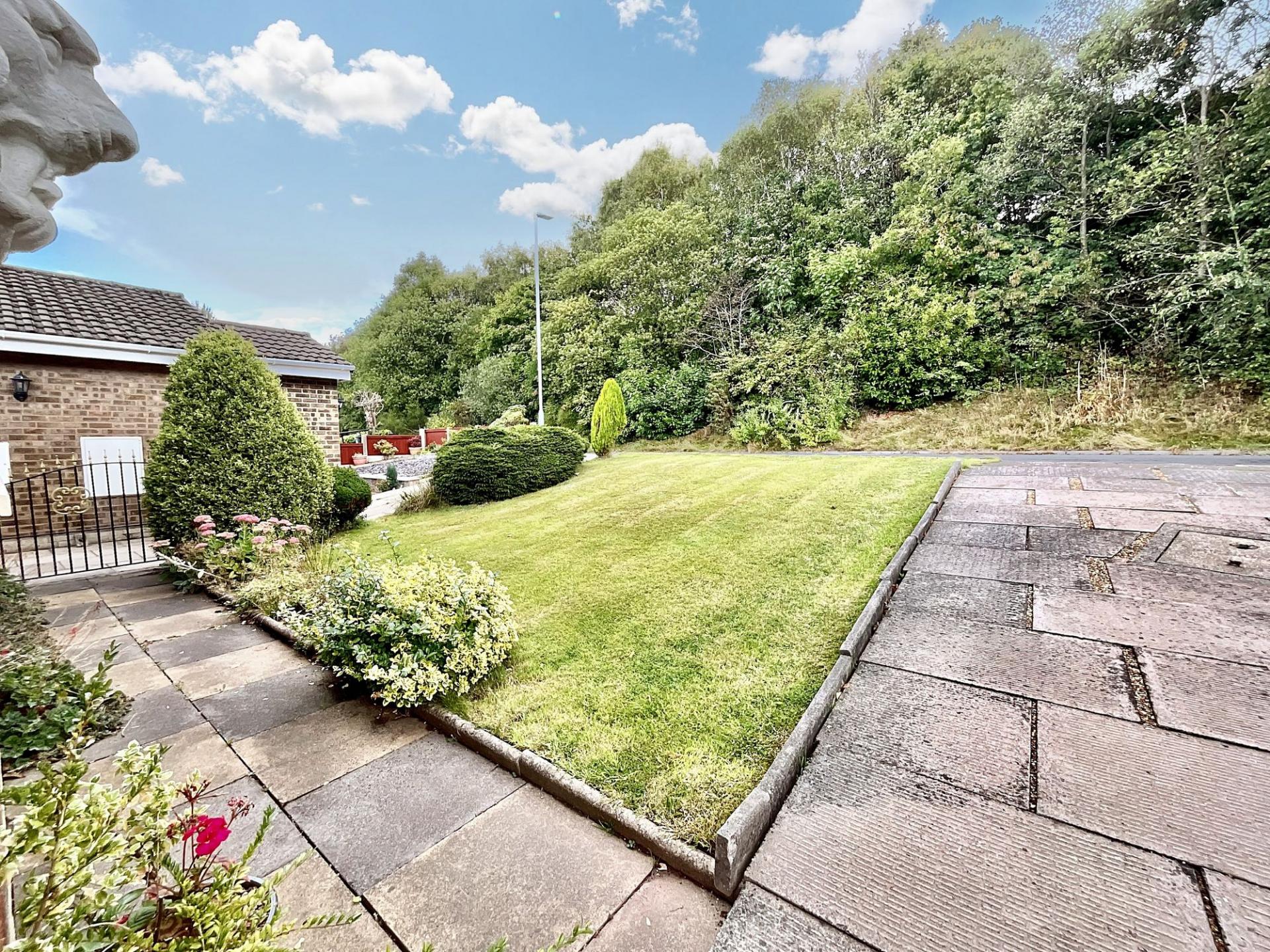 - A lush green lawn framed by mature shrubs creates a peaceful sanctuary of greenery. Parking is no issue, thanks to a tandem driveway.