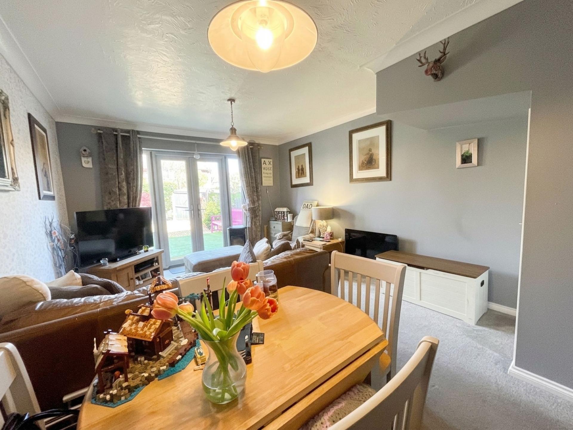 - Cozy living room with a glazed French door to the garden. Kitchen with wood-grain cabinetry, stainless steel sink, and space for appliances.