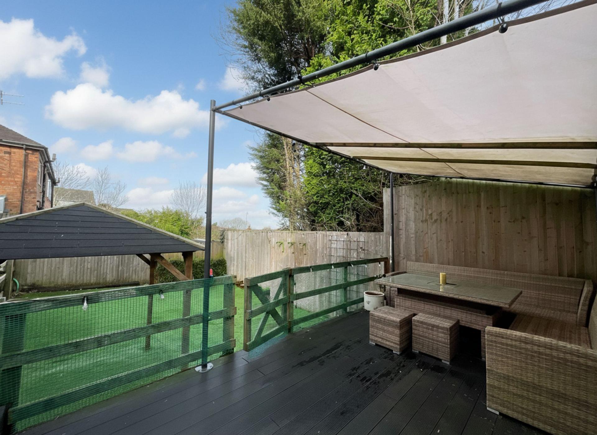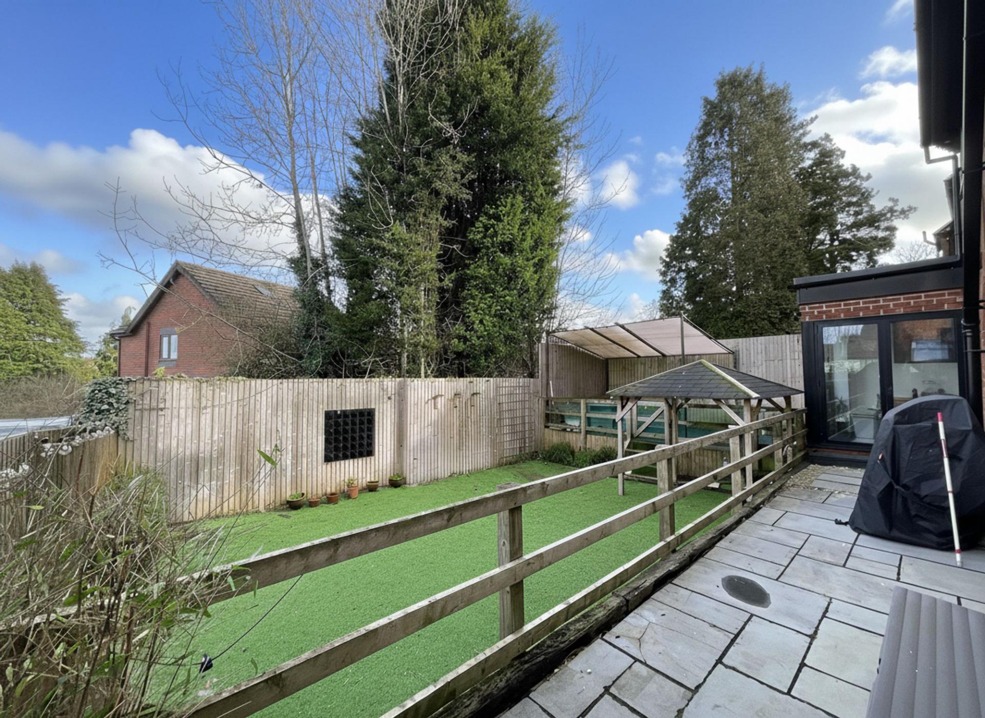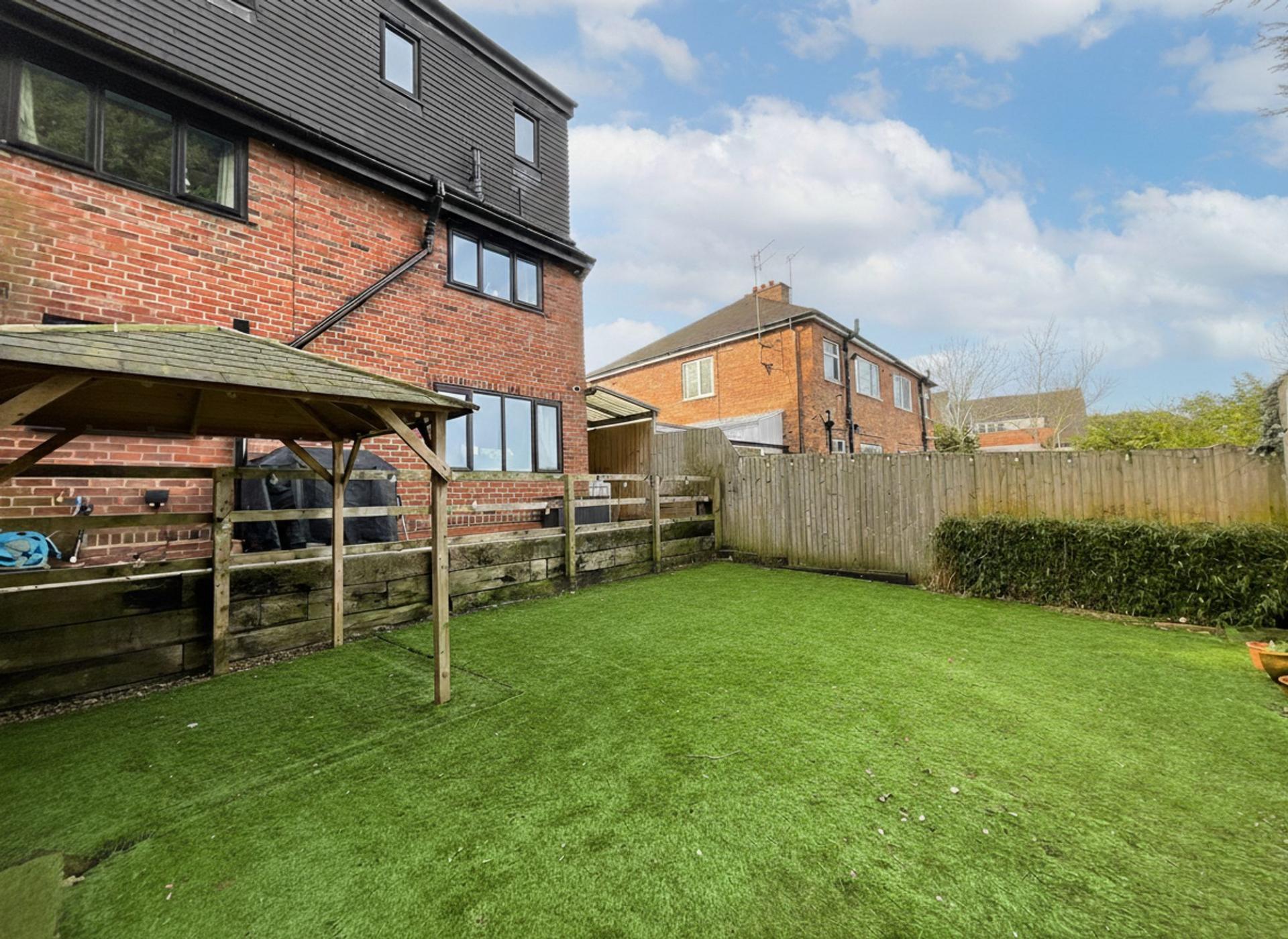 - Rear garden with block-paved patio, artificial lawn and powered pergola, plus a gravelled driveway to the front with shrubbery for kerb appeal.