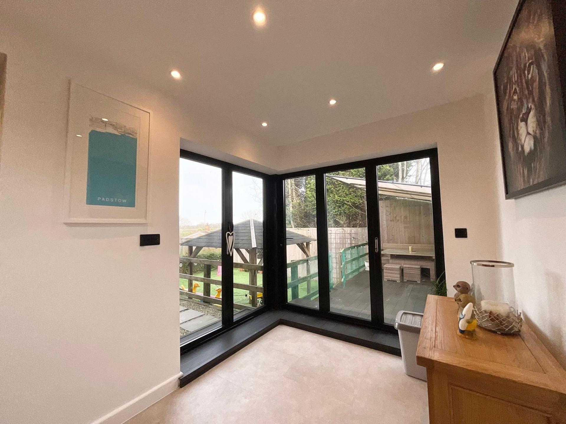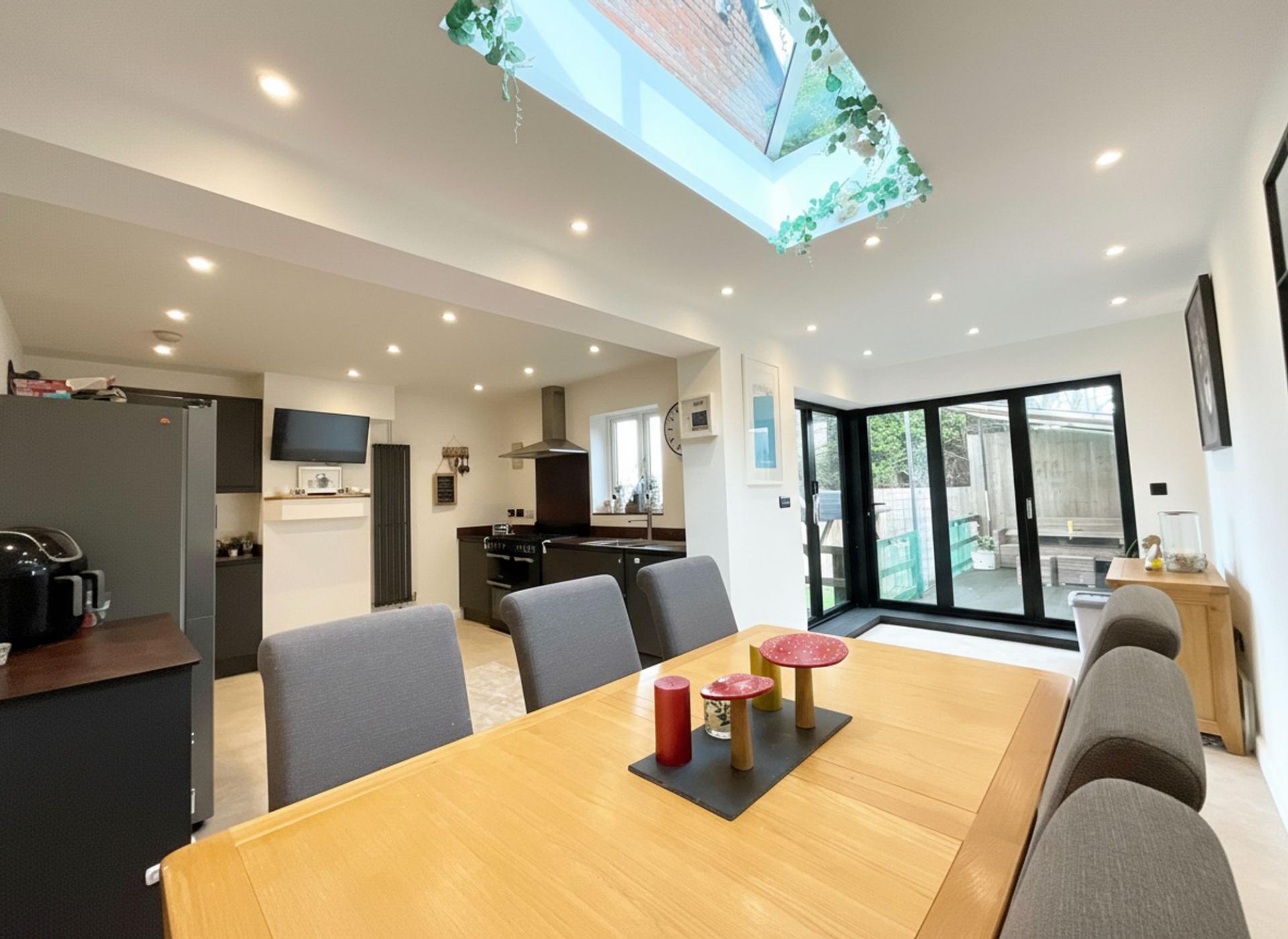 - Spacious living room with log burner and dual-aspect windows, plus an open-plan L-shaped kitchen diner with sleek black cabinets, bi-folds, dishwasher, WC and separate utility room.