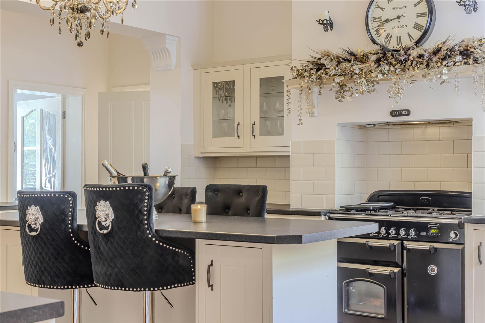Kitchen - 5.71 x 4.65 (18'8" x 15'3" ) - Wood effect flooring. A range of shaker style wall and base units. Integrated dishwasher, wine fridge, ceramic sink and drainer unit with mixer tap above. Space for range style cooker. Space for American style fridge freezer. Kitchen island with integrated storage and breakfast bar. Wooden window to the rear aspect. Three ceiling lights.