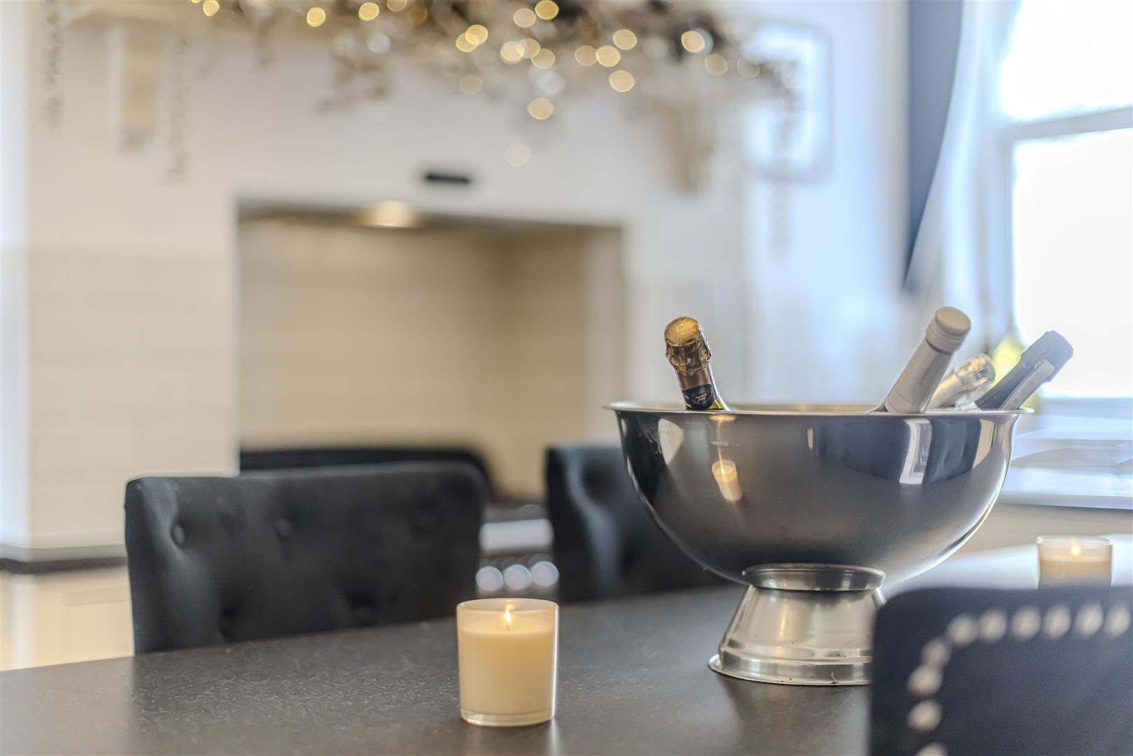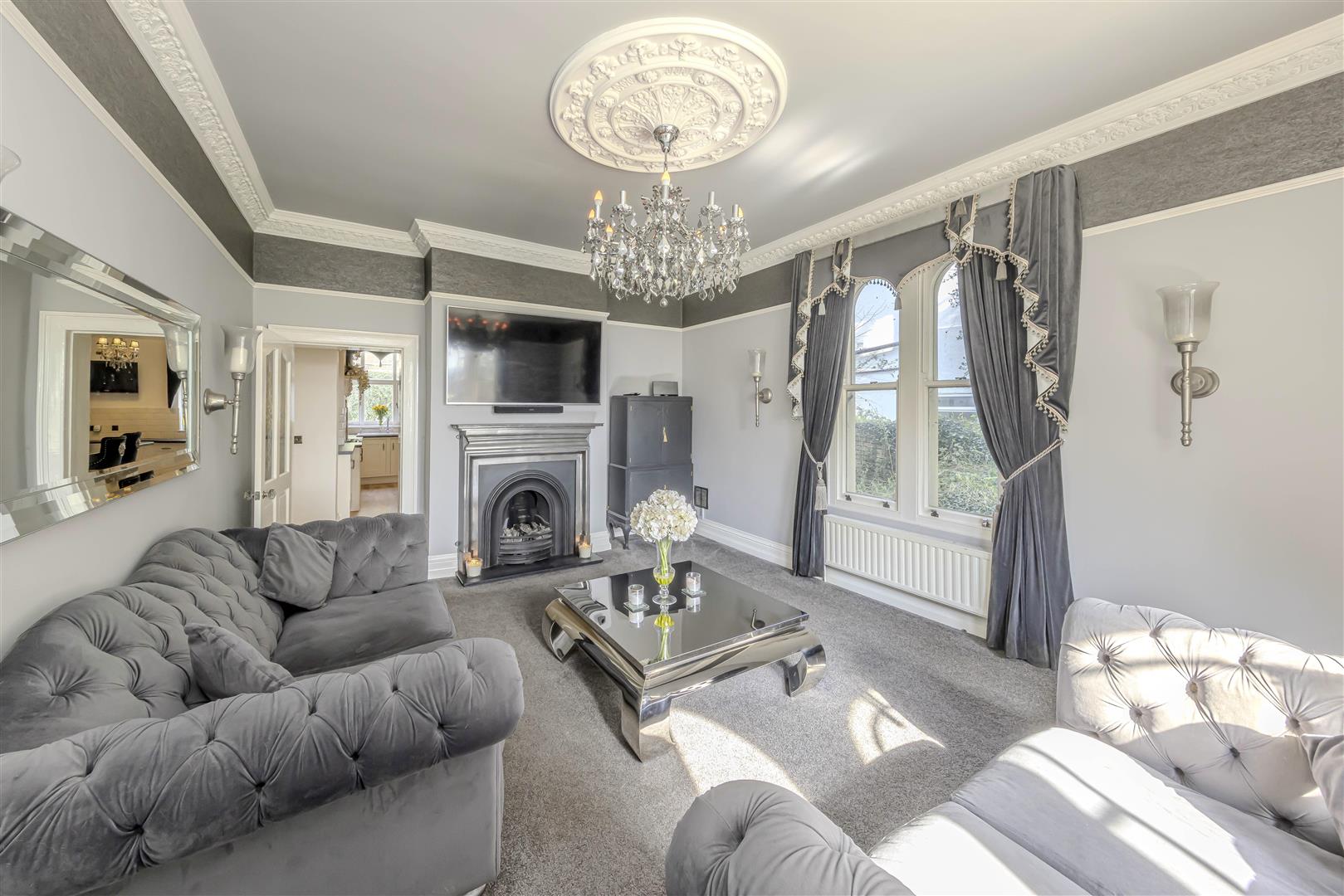 From the moment you step inside, the spacious entrance hall sets the tone, leading to two impressive reception rooms at the front of the home. These rooms showcase stunning stone mullioned arched bay windows, intricate cornicing, and period fireplaces - all hallmarks of the property's refined heritage. The large, neutrally decorated kitchen is thoughtfully appointed with shaker-style cabinetry, a breakfast bar island, and ample space for informal dining. A useful study, second entrance hall, downstairs bathroom, and utility room complete the generous ground floor layout.