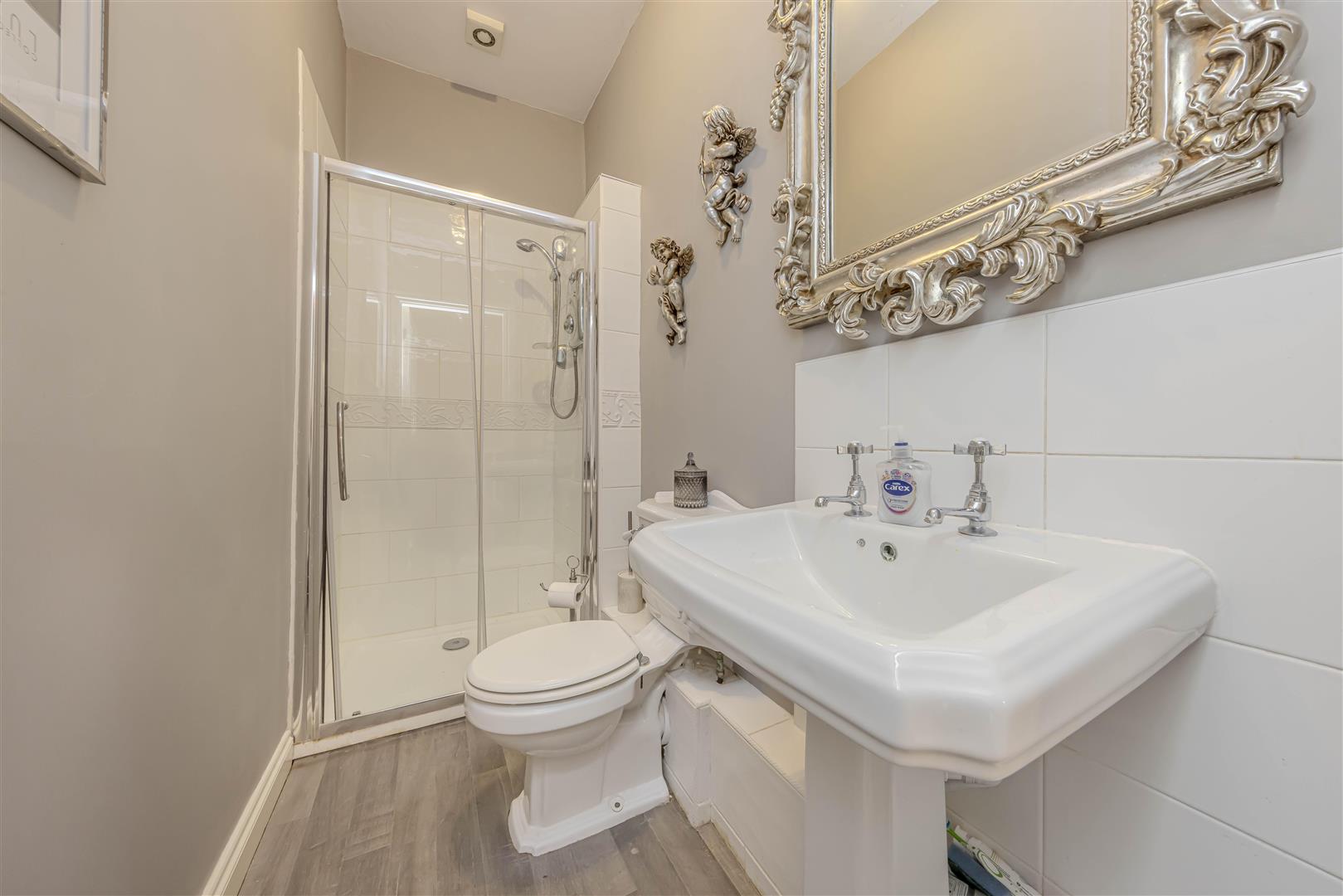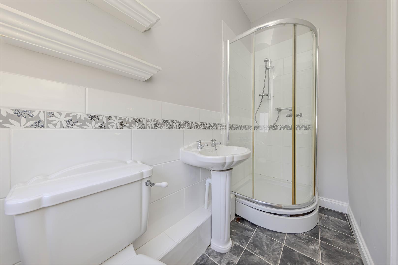 En-Suite Shower Room - 1.17 x 2. 54 (3'10" x 6'6" 177'1" ) - Vinyl flooring. Low-level WC. Pedestal wash hand basin. Shower cubicle with shower. Wall mounted radiator. Wooden obscured sash window to the side aspect.
