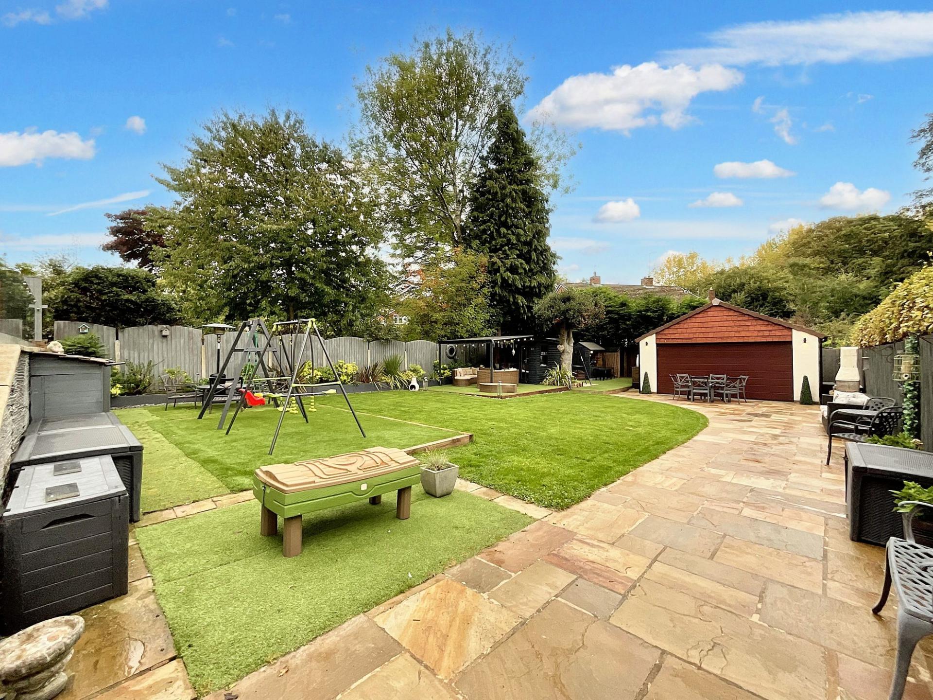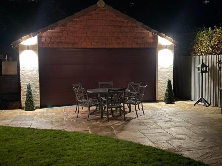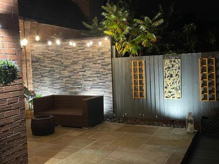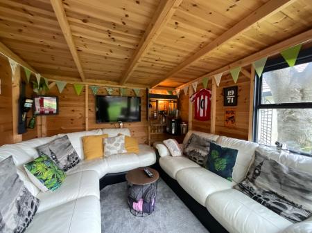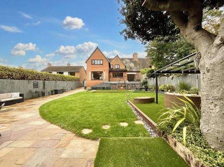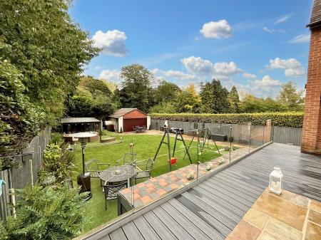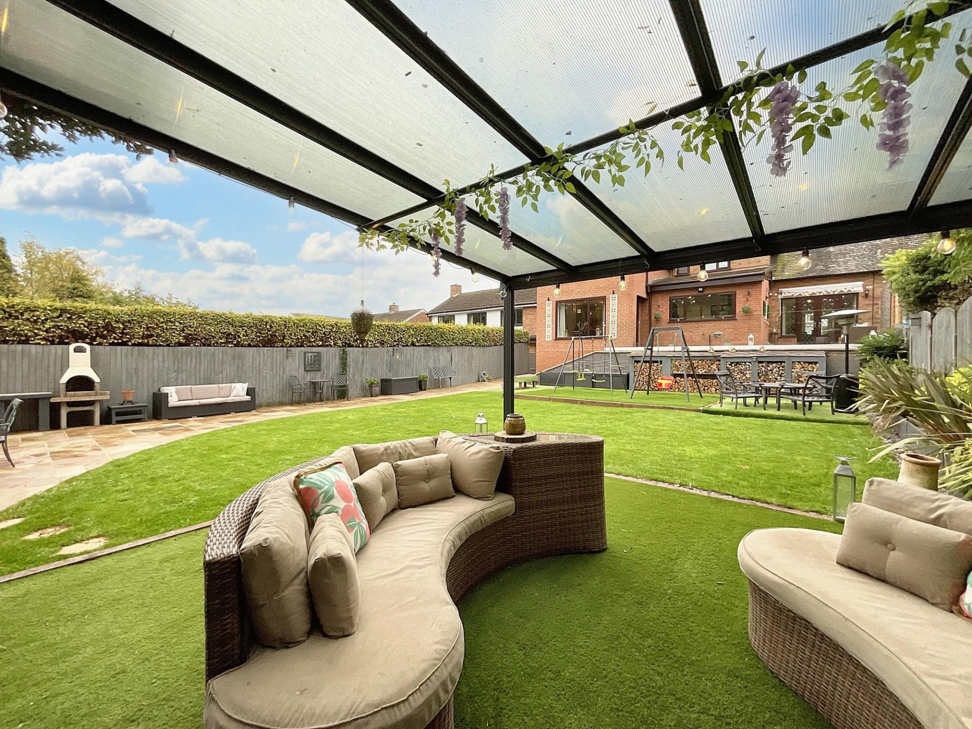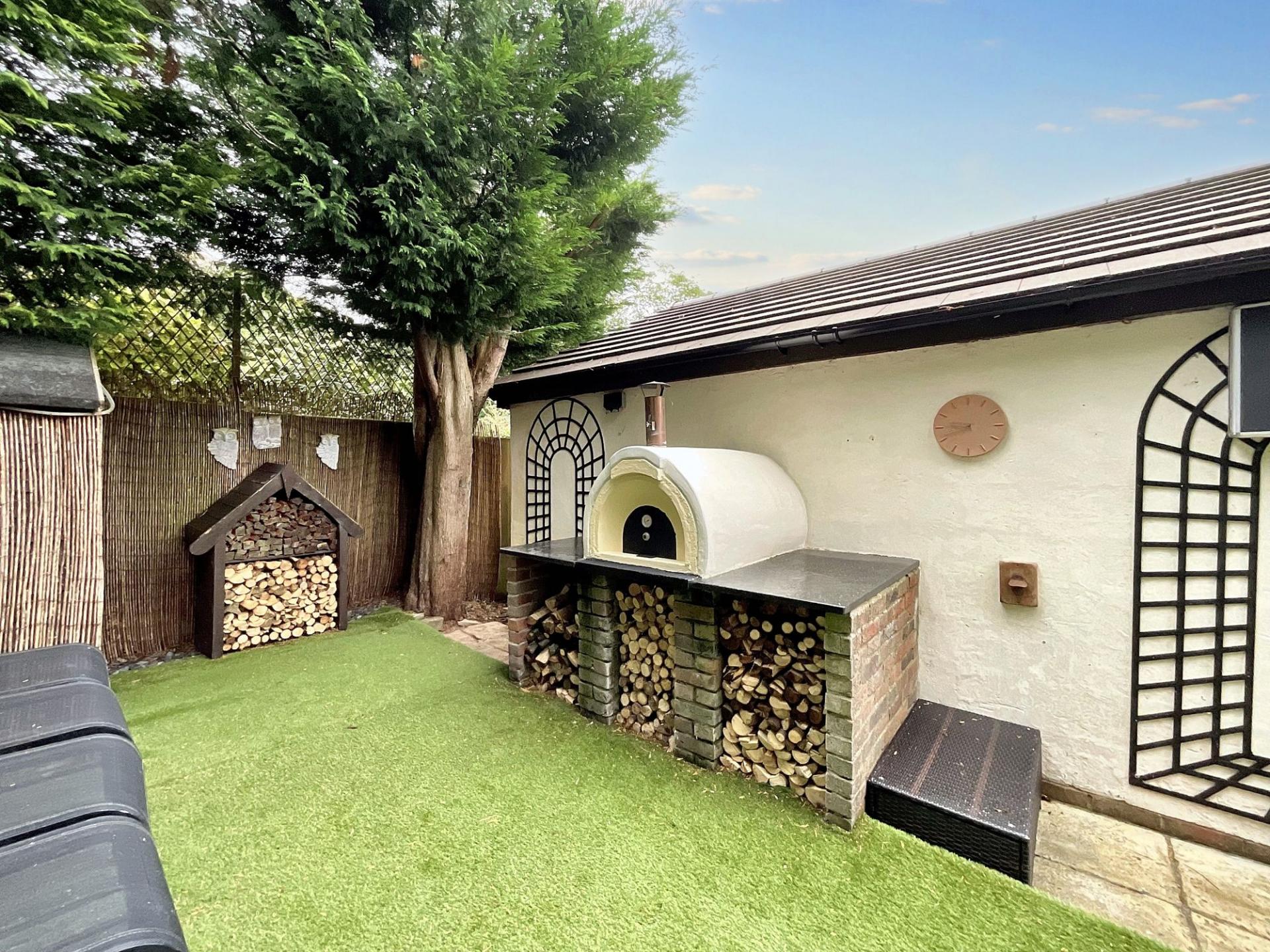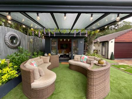 - Beautifully landscaped rear garden with upper tiered patio seating space, glass balustrade and composite decking. Lush grass lawns, bespoke pizza oven, and purpose built summer house.