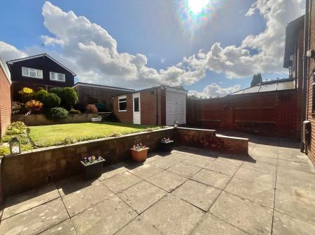 - Tiered rear garden featuring patio seating space, a lush grass lawn and mature shrubbery.