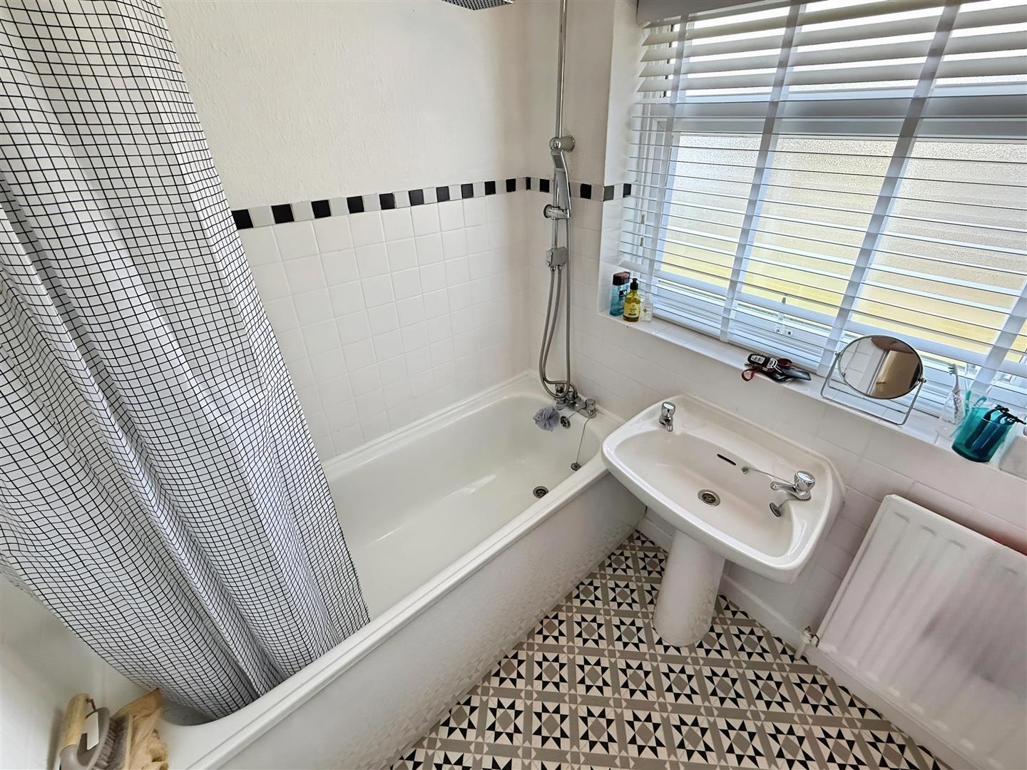 Bathroom - 2.69 x 1.69 max (8'9" x 5'6" max ) - Vinyl flooring. Wall mounted radiator. Pedestal style wash and basin. WC. Bath tub with shower attachment and rain style shower. Obscured double glazed window. Ceiling light.