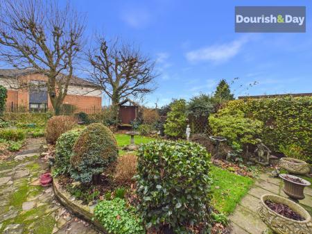 Outside, the rear garden is neatly laid out and easy to maintain. A paved area sits directly behind the conservatory, with a pathway running up the left-hand side of the garden. To the right of the path is a lawned section, separated by a flower bed filled with mature shrubs, while a summer house sits partway up the garden with a small gated area beside it, ideal for discreet bin storage. At the rear right corner, a covered wooden bench provides a charming seating spot, and a further small gate at the rear left offers access to the pathway behind the property.