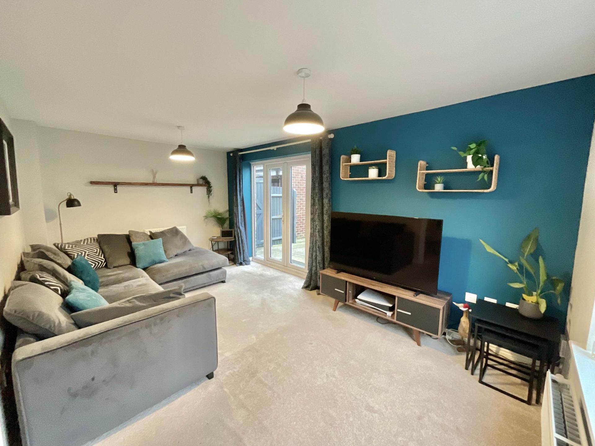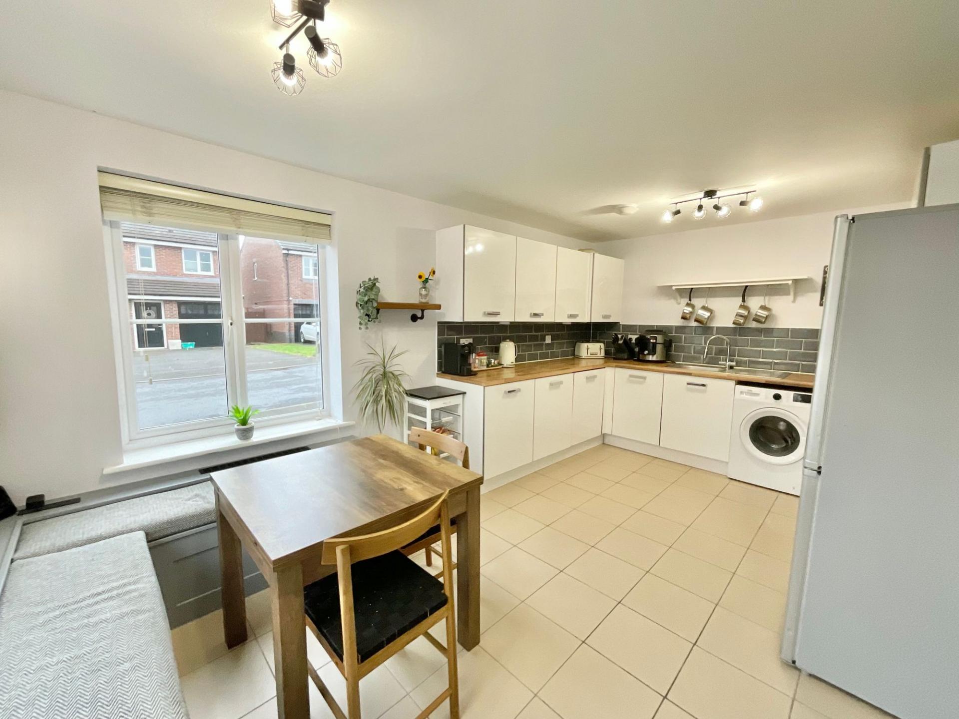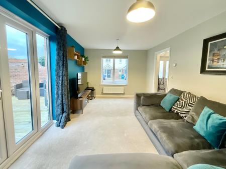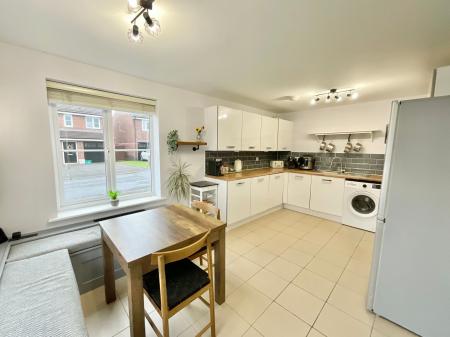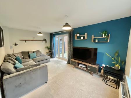 - Open-plan kitchen/diner with contemporary cabinetry, space for appliances and cosy corner seating area. Spacious living room with glazed French doors. W/C and storage cupboard.