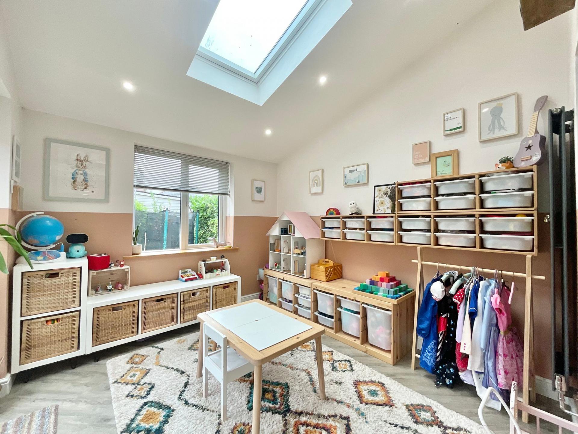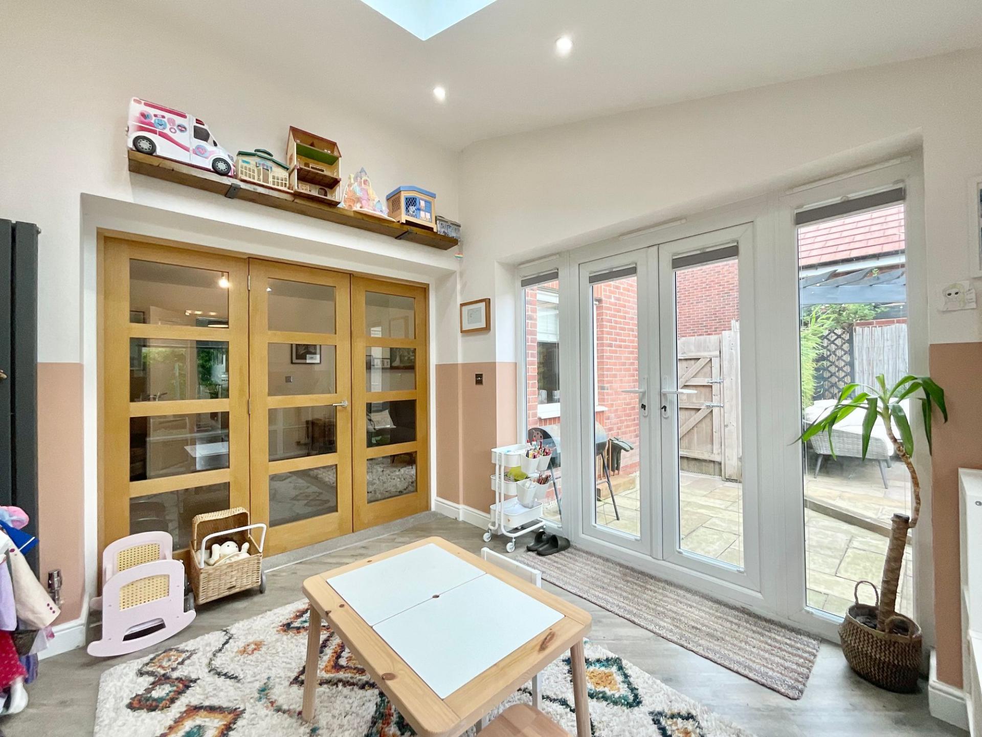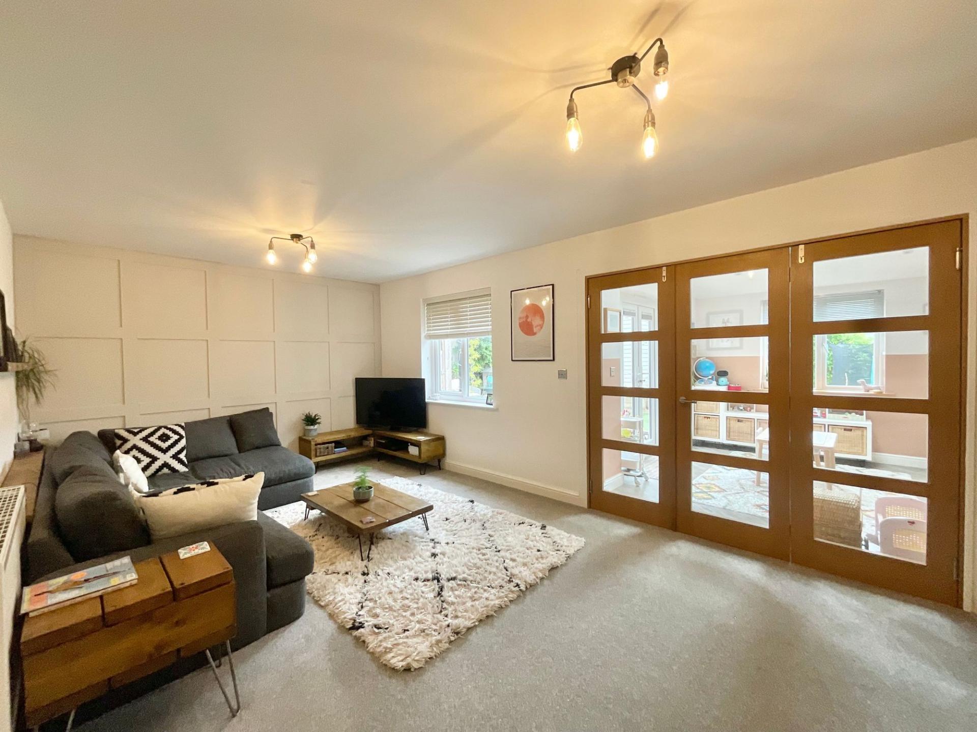 - Open-plan kitchen/diner with practical U-shaped kitchen, integrated appliances and plenty of room for dining. The living room leads though ladder-style doors into a bright extended family room.