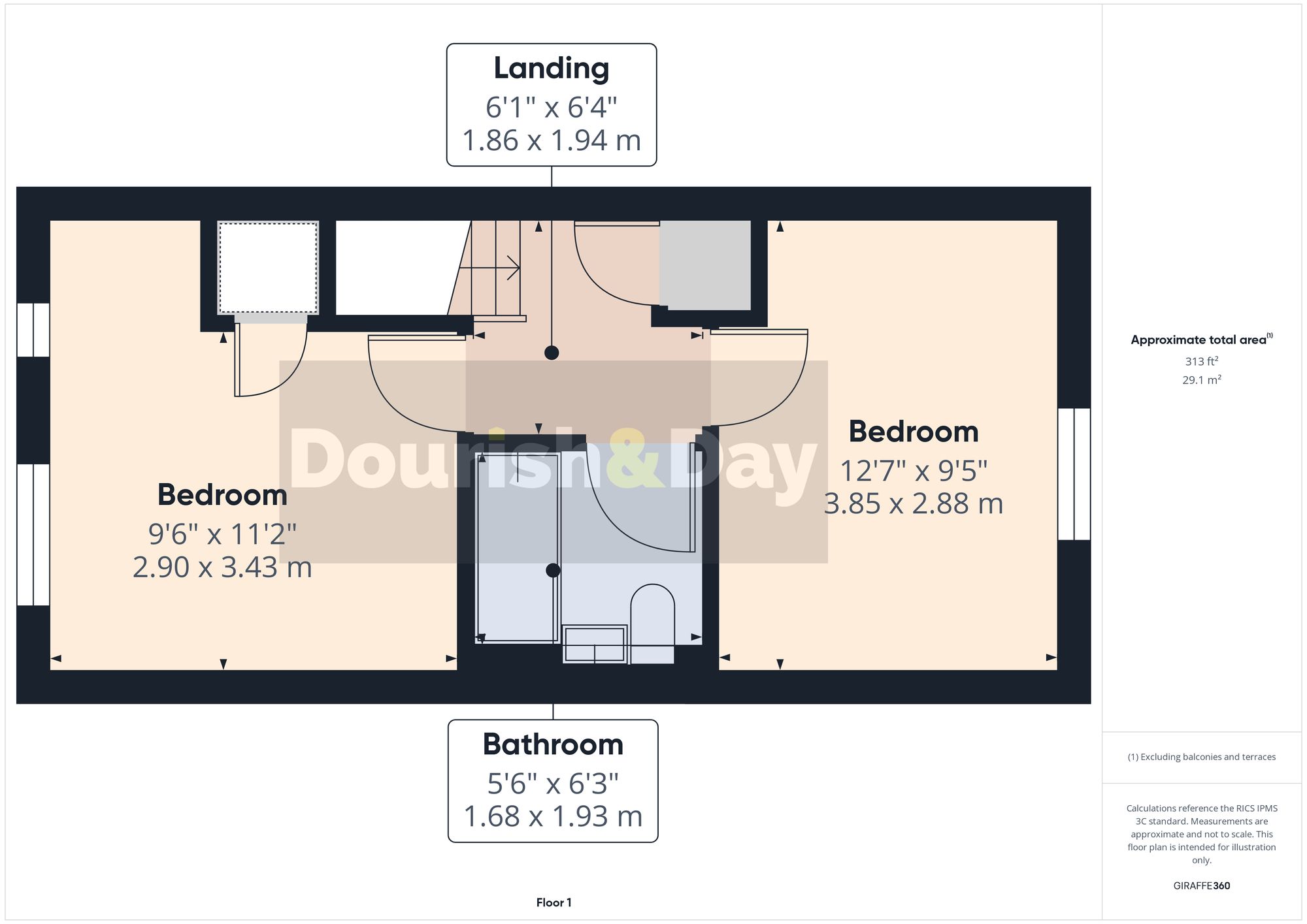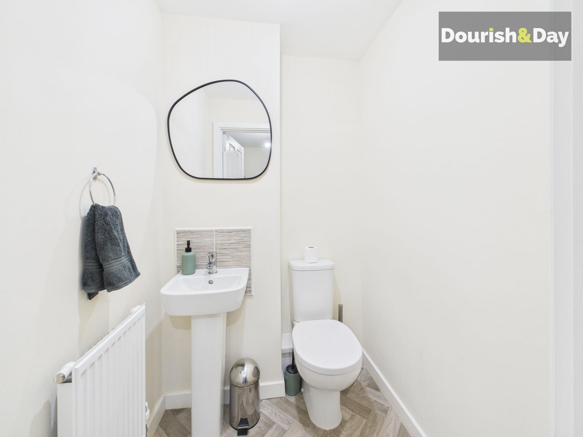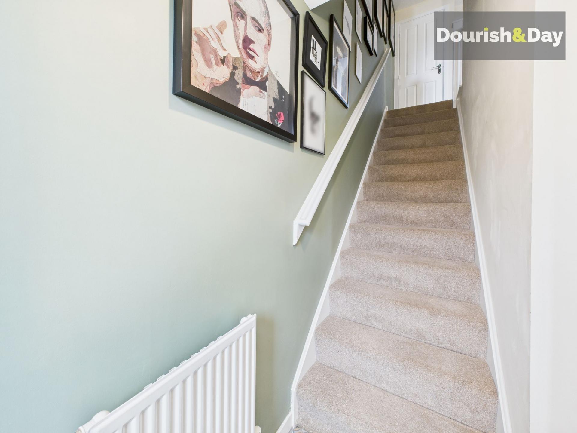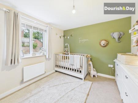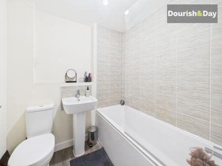 Upstairs, the first-floor landing includes an airing cupboard and access to two double bedrooms and the family bathroom. The principal bedroom to the front benefits from over-stairs storage, while the rear double offers ample space for wardrobes and furnishings. The family bathroom is stylishly finished, featuring modern tiling and a shower over the bath for convenience.