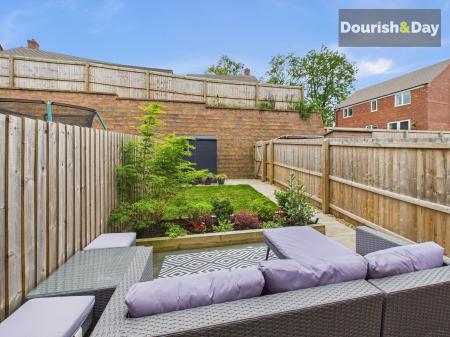 Outside, the garden has been thoughtfully designed with multiple seating areas and a great sense of privacy, thanks to a high rear wall and elevated neighbouring properties beyond. The layout includes a paved patio just off the kitchen, leading to a decked area, then a flower bed and a central lawn, with a paved path continuing to a rear patio area housing a handy garden shed.
