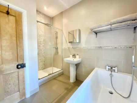 - Generously sized master bedroom, further double and single bedroom with flexibility for a nursery, office, or dressing room. Sleek bathroom with a tub, shower, sink, and W/C.