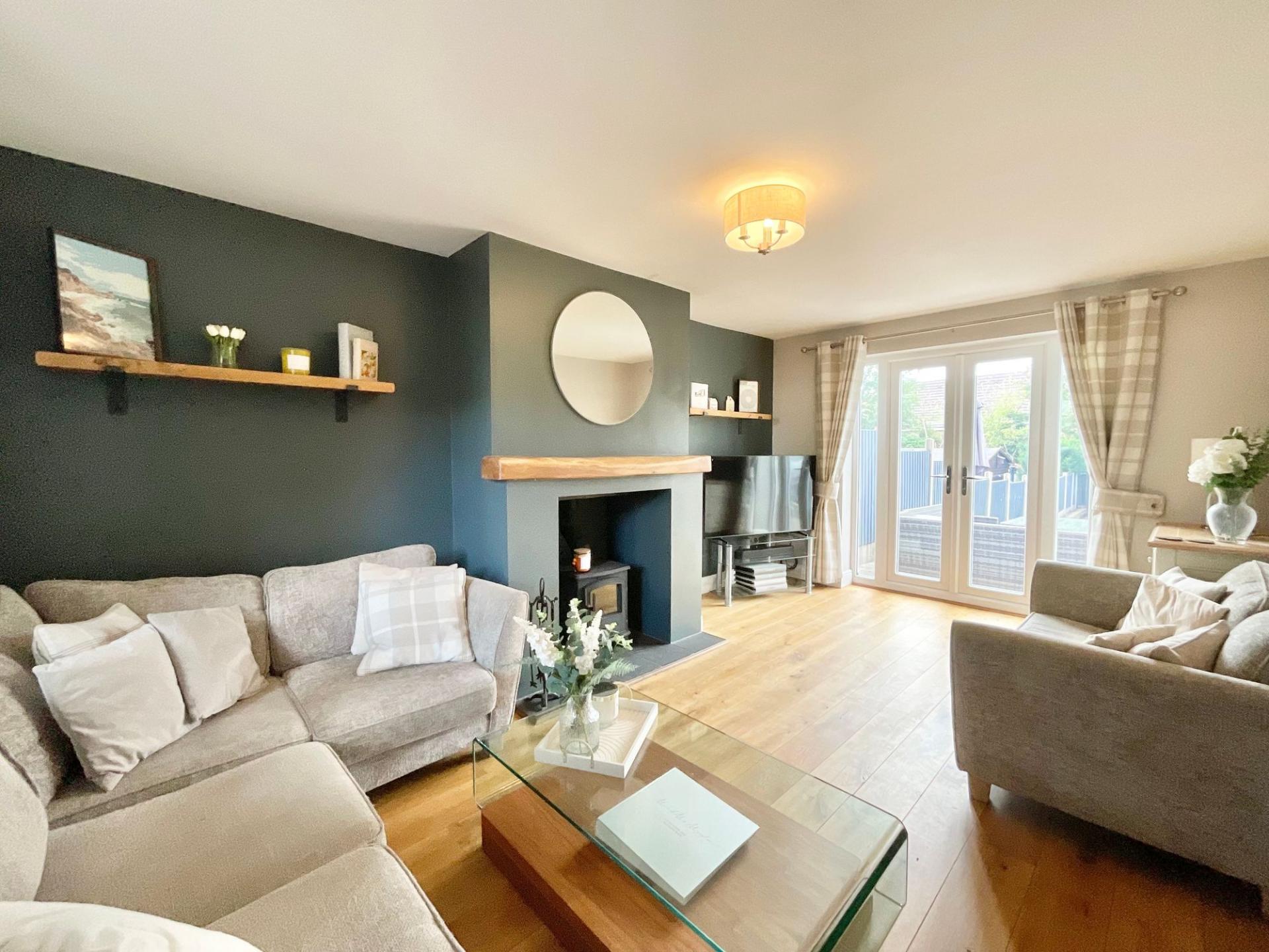- Warm and inviting living room with log burner and glazed French doors. Spacious kitchen/diner with plenty of room for appliances, plus a separate utility and W/C.