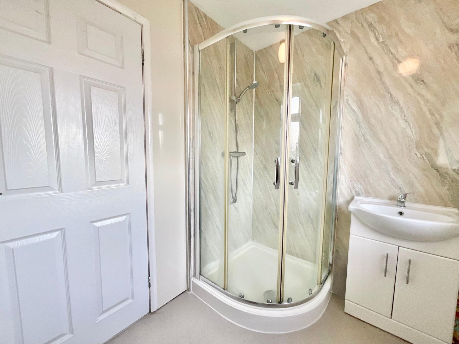 - Three generously sized double bedrooms and a shower room with sleek floor-to-ceiling panelling, a corner shower, a sink, and a W/C.