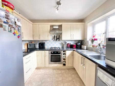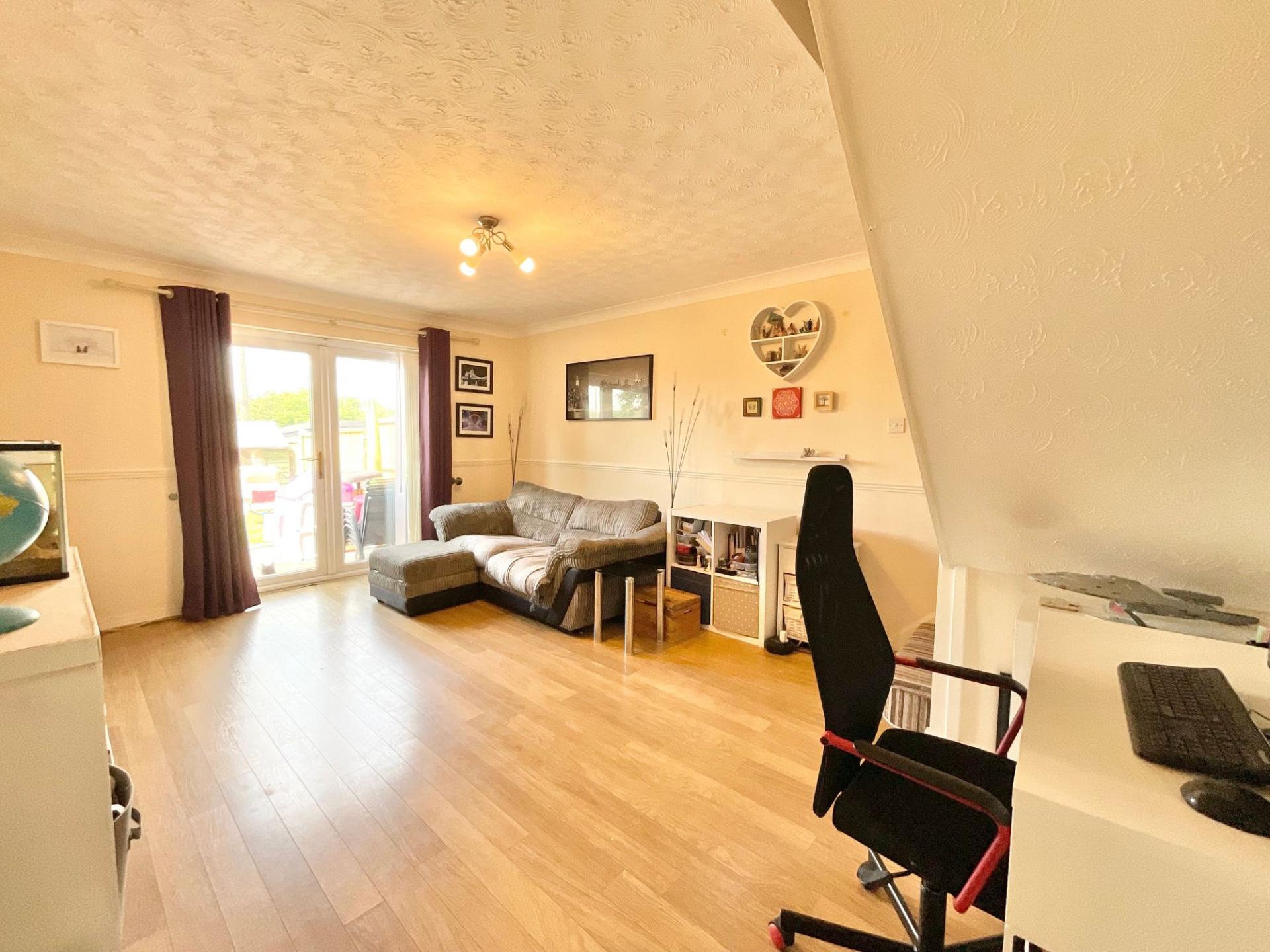 - Spacious living room with plenty of space for relaxation and glazed French doors to the rear, plus a practical U-shaped kitchen with room for appliances.