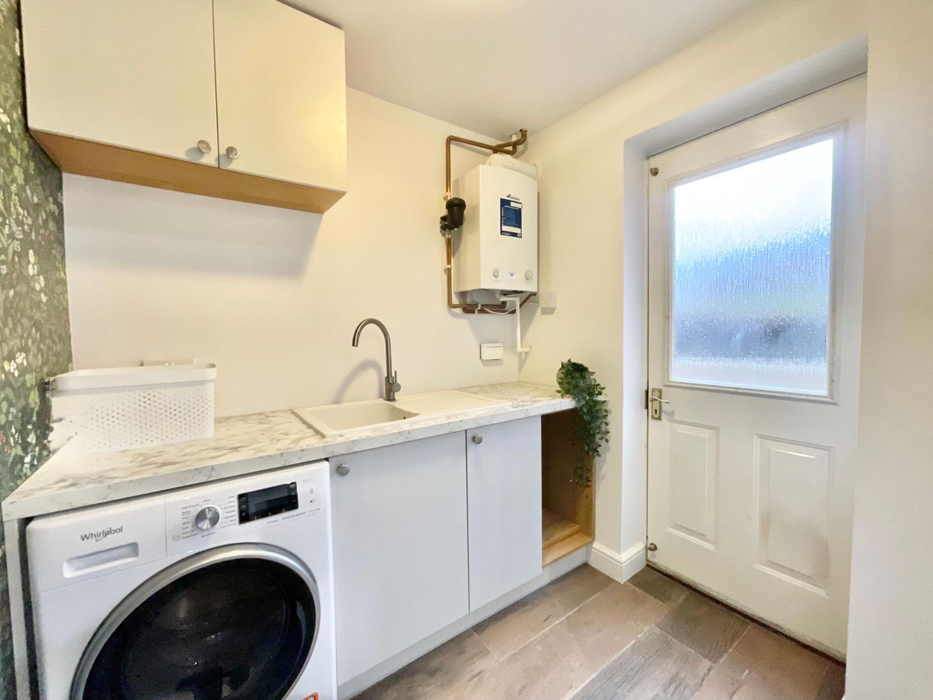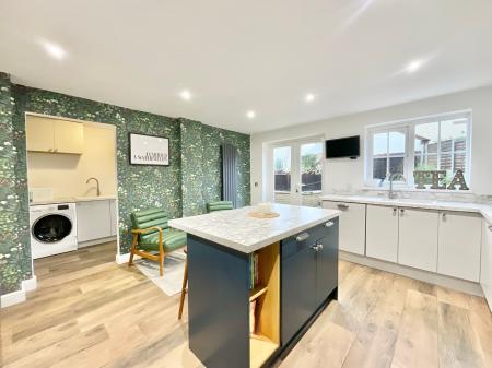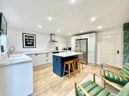 - Open-plan kitchen/breakfast room with modern kitchen and island with a breakfast bar, separate utility, dining room and living room.