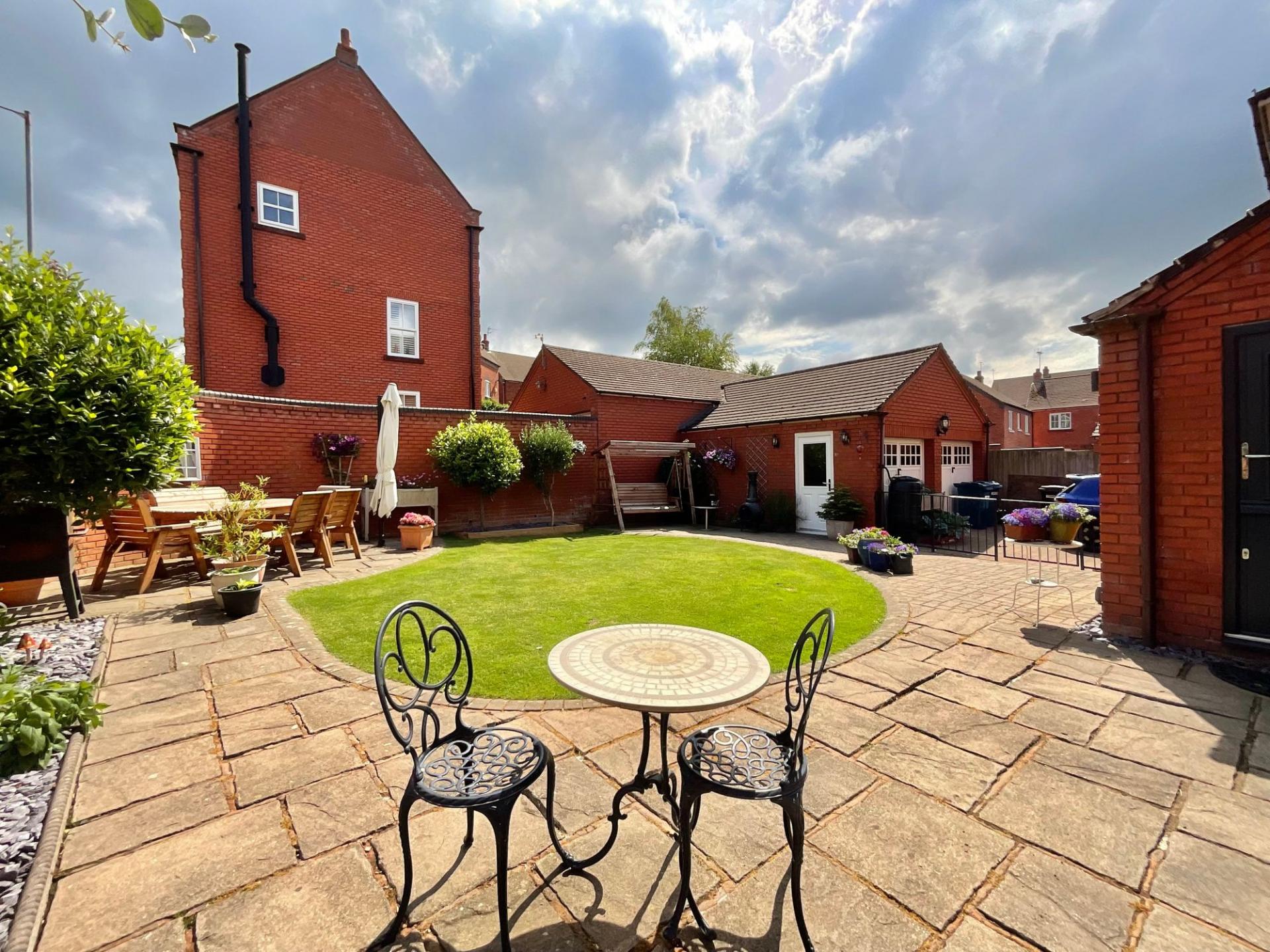 - Spacious rear garden with lush grass lawns and patio seating space, calling for summer BBQs, garden games, and golden hour drinks.