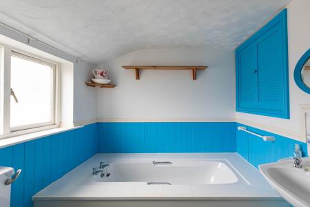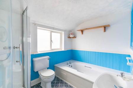 On the first floor, bedroom two benefits from a decorative fireplace with iron grate and a useful under stairs storage recess. Also on this level is a well appointed bathroom fitted with a bath and a separate shower cubicle, together with additional over stairs storage.