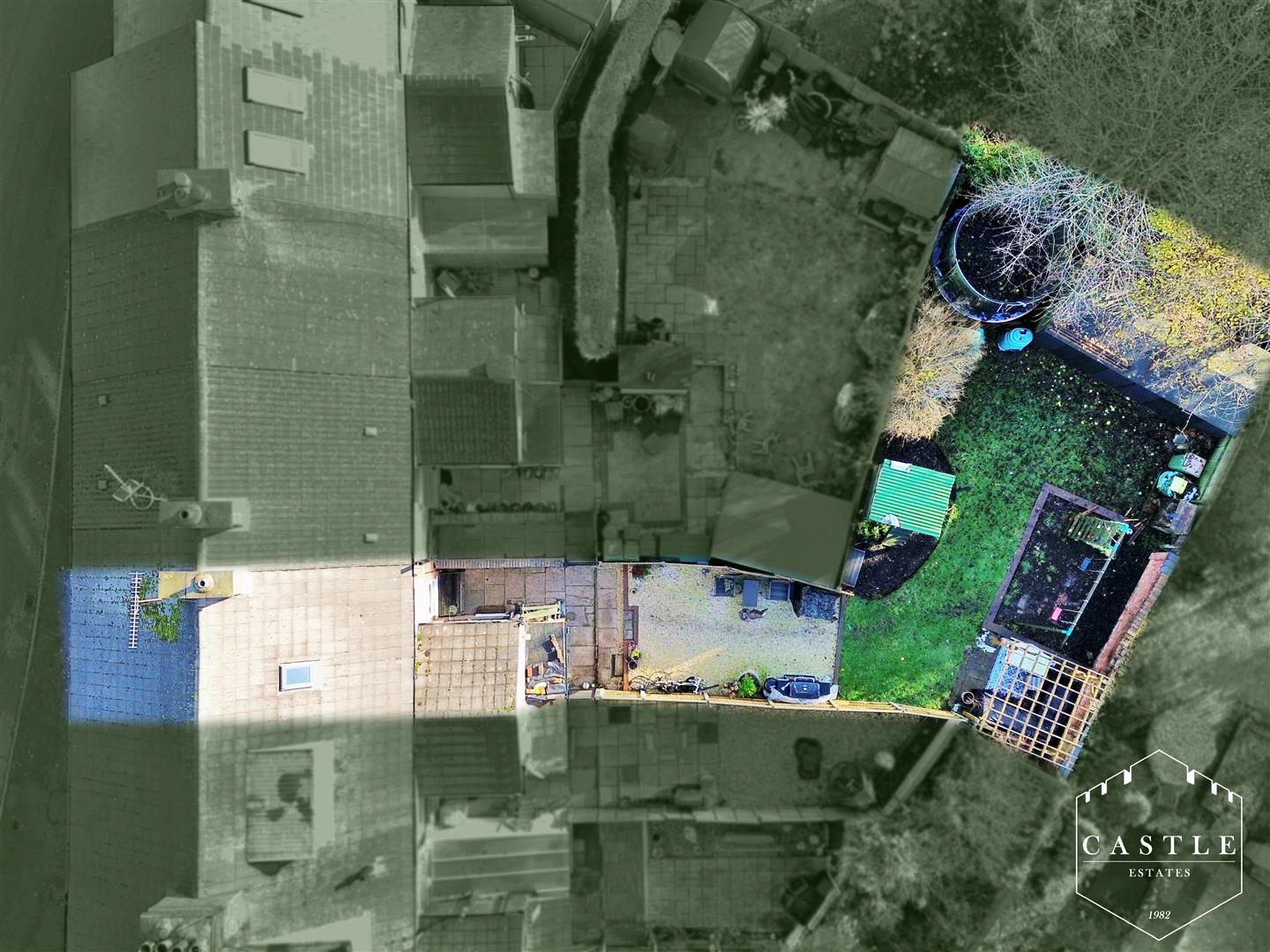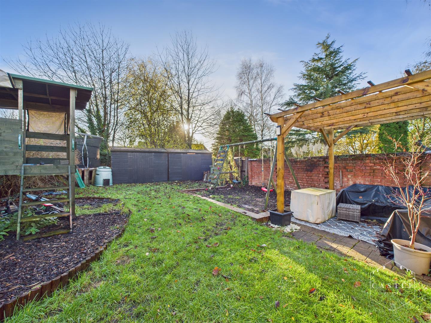 Outside - Shared pedestrian access to a fully enclosed rear garden with gate, slabbed courtyard area with steps up to gravel area, lawn, pergola, walled and fenced boundaries.