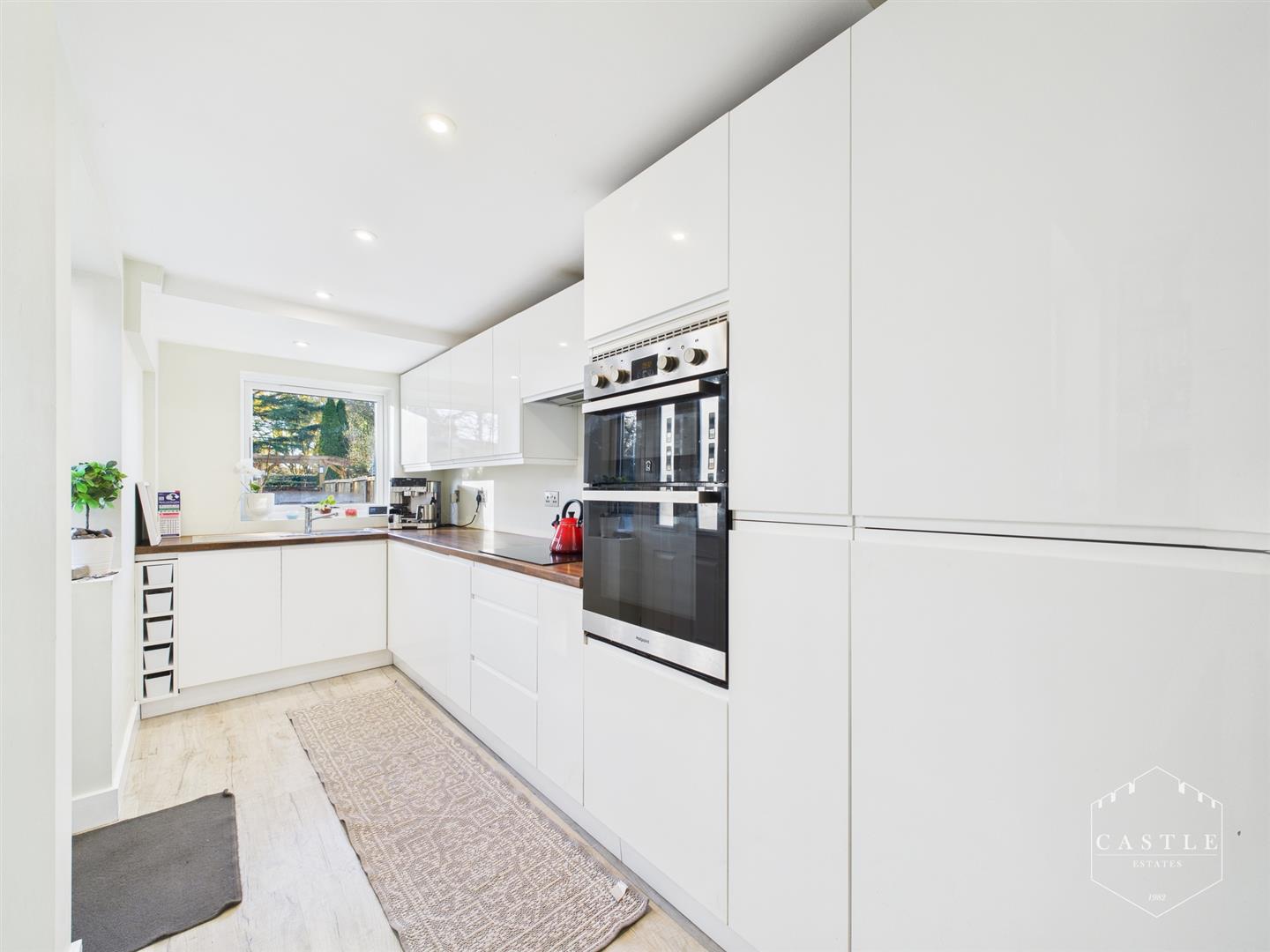 Kitchen - 3.66m x 1.78m (12'0" x 5'10" ) - having an attractive range of contemporary white gloss units including ample base units, drawers and wall cupboards, contrasting work surfaces and inset sink with mixer tap, built in electric oven, induction hob with cooker hood over, integrated washing machine, integrated dishwasher, integrated fridge freezer, inset LED lighting, wood effect flooring, upvc double glazed window to rear and side door to Garden.
