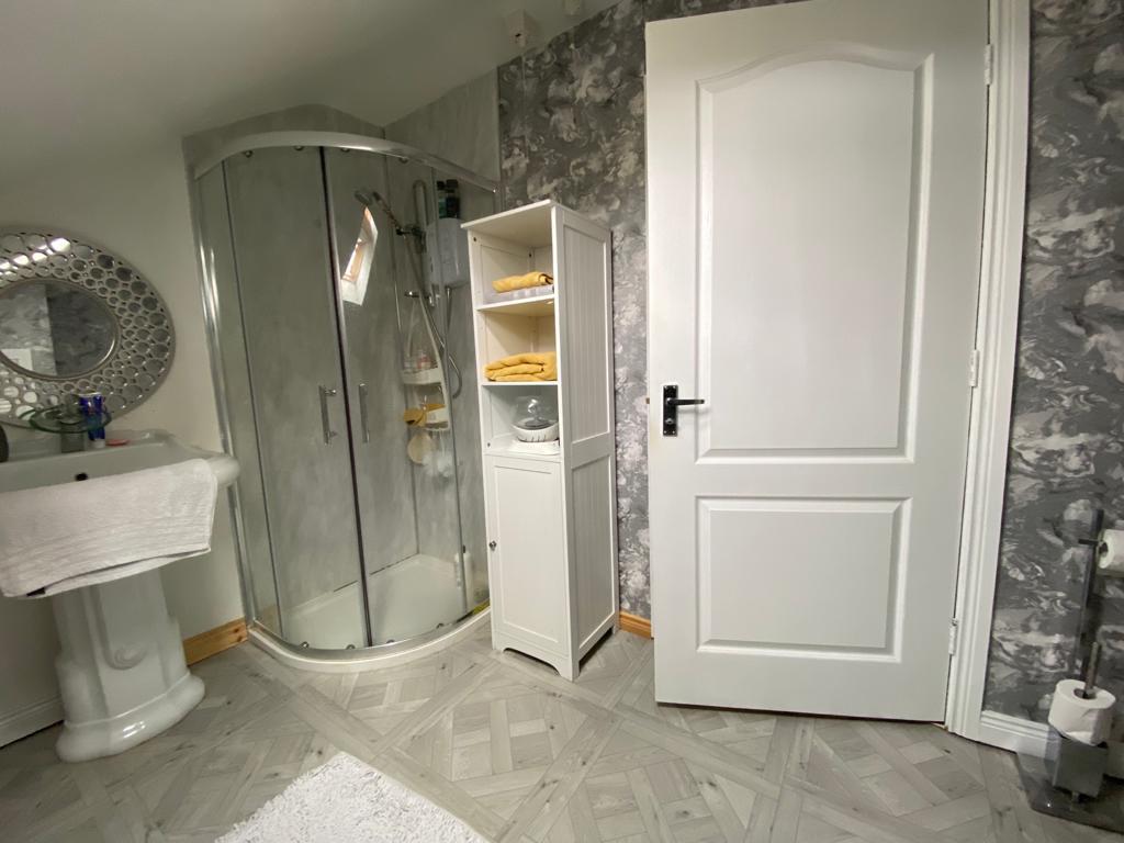 comprising shower with pvc cladding to walls, WHB and WC, hotpress