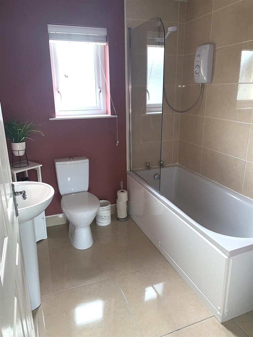 Comprising bath with electric shower over, shower screen, whb and wc, partly tiled around bath, tiled floor.