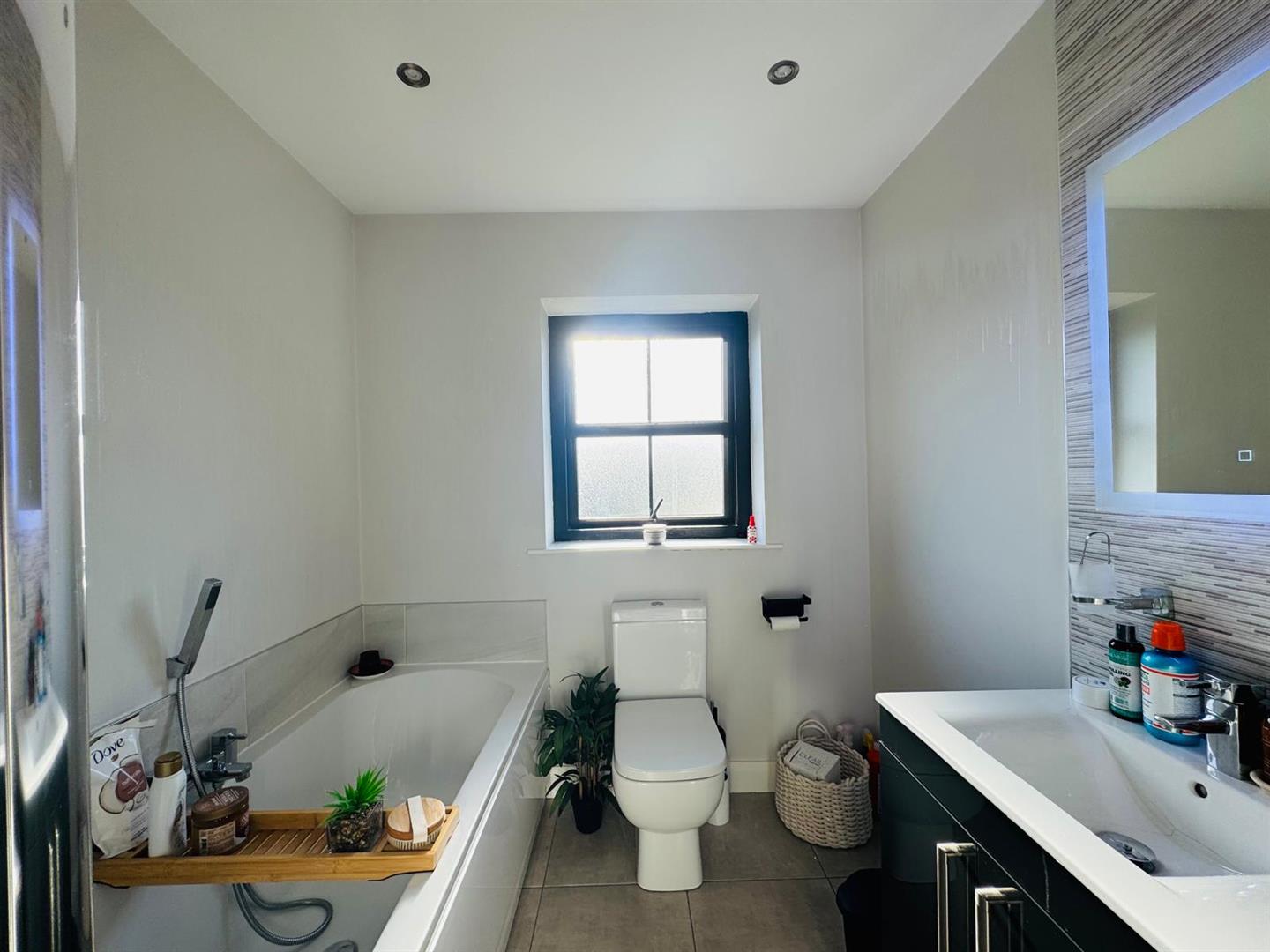 Comprising bath with hand shower attachment to taps, fully tiled walk in shower, whb set in vanity unit, wc, recessed lighting, tiled floor.
