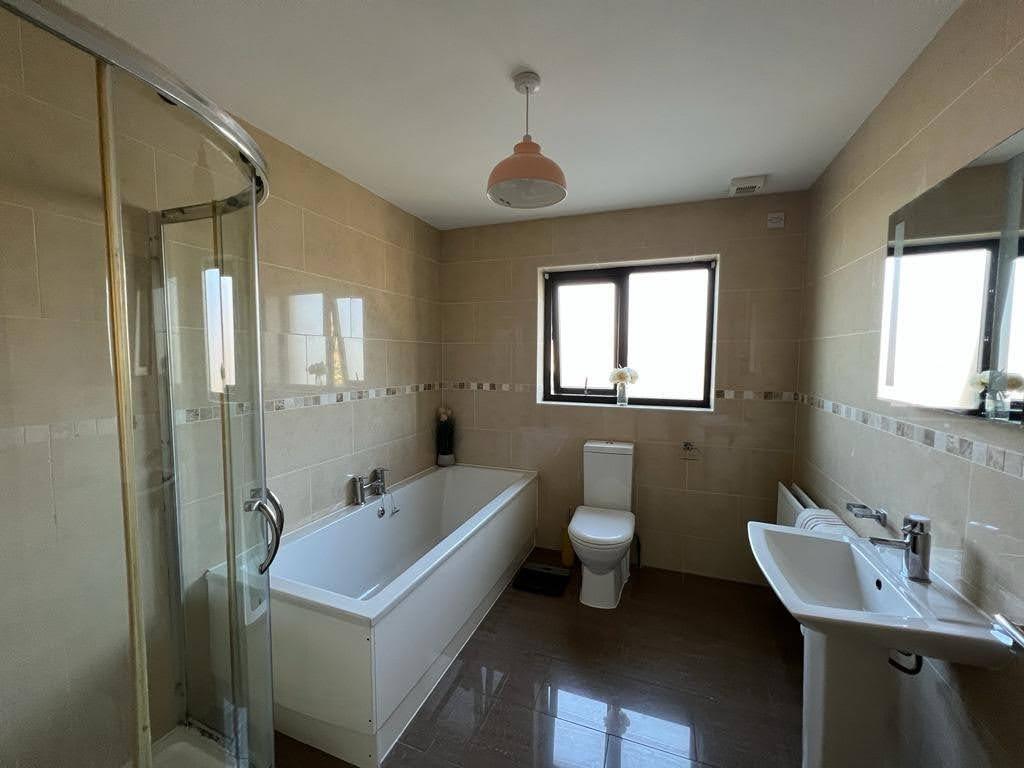 Comprising bath, walk in electric shower, fully tiled walls and floor.