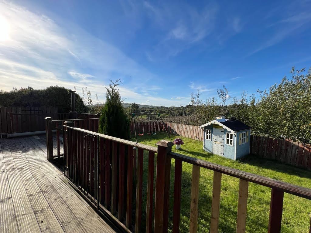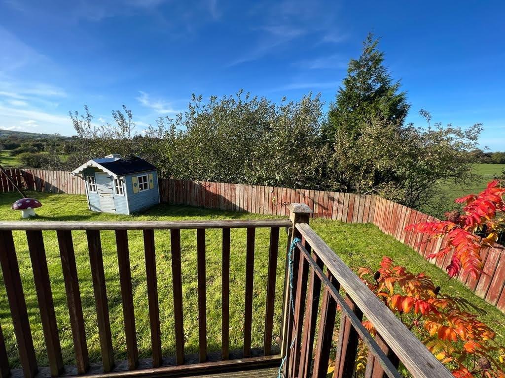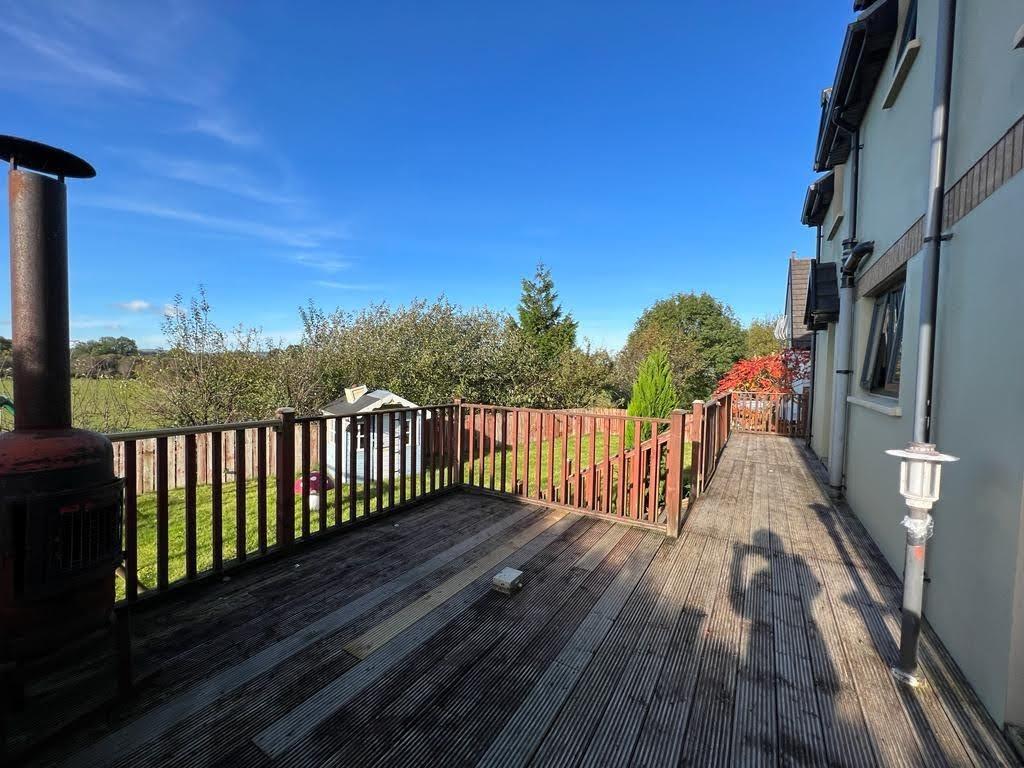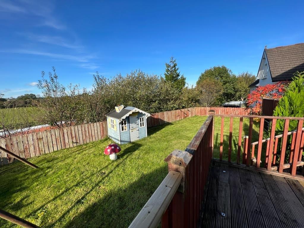 Decked patio area to rear leading to lawn enclosed by fence and gate.