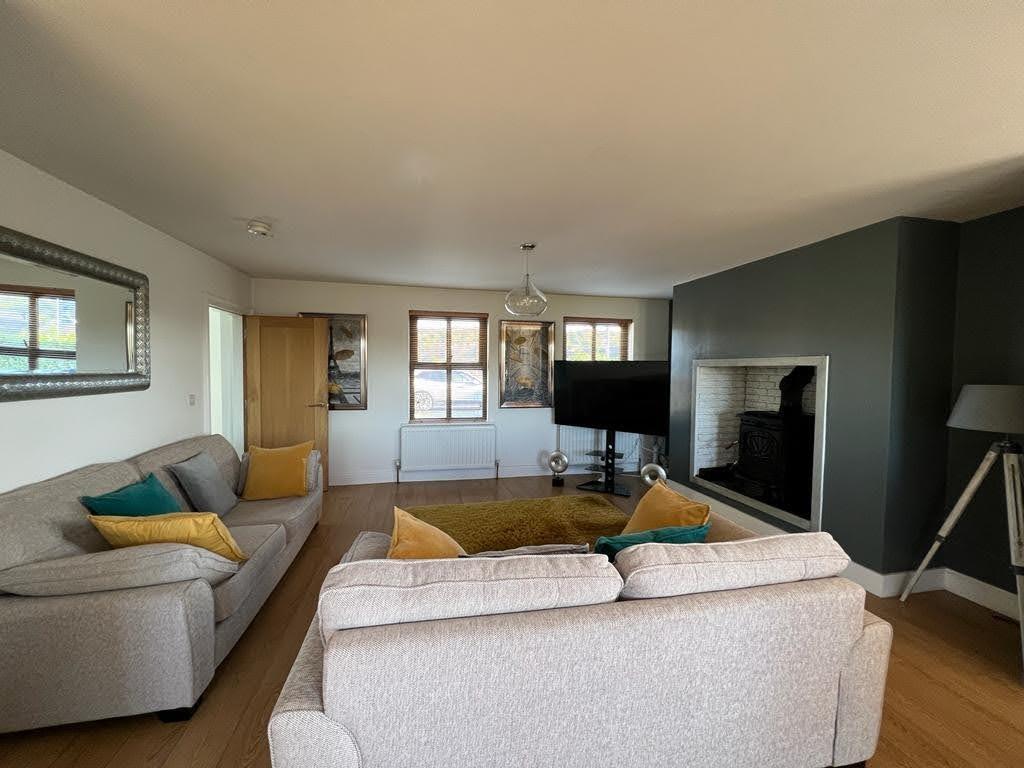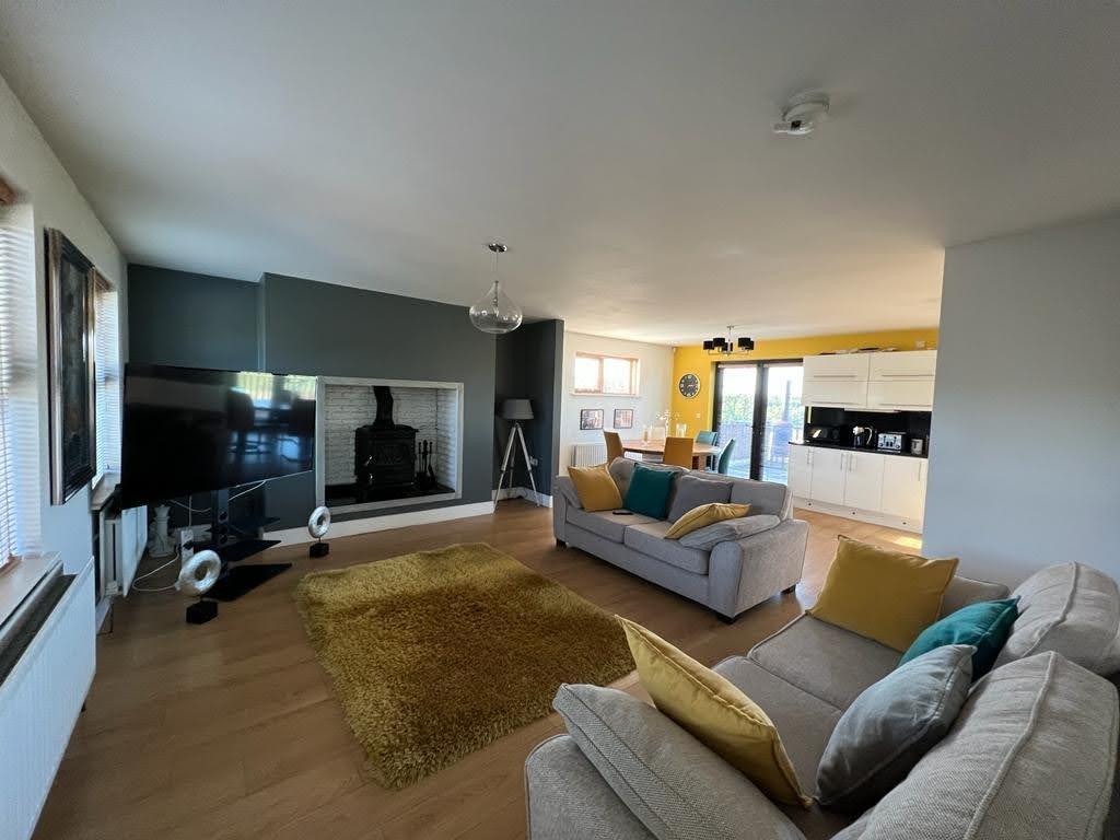 4.75m x 3.96m (15'7" x 13') - Having multi fuel stove set on raised tiled hearth with brick surround, laminated wooden floor, open plan to Kitchen / Dining Area.