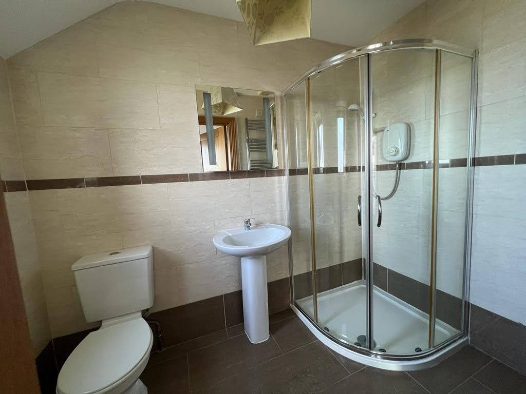 Comprising walk in electric power shower, whb and wc, fully tiled walls and floor.