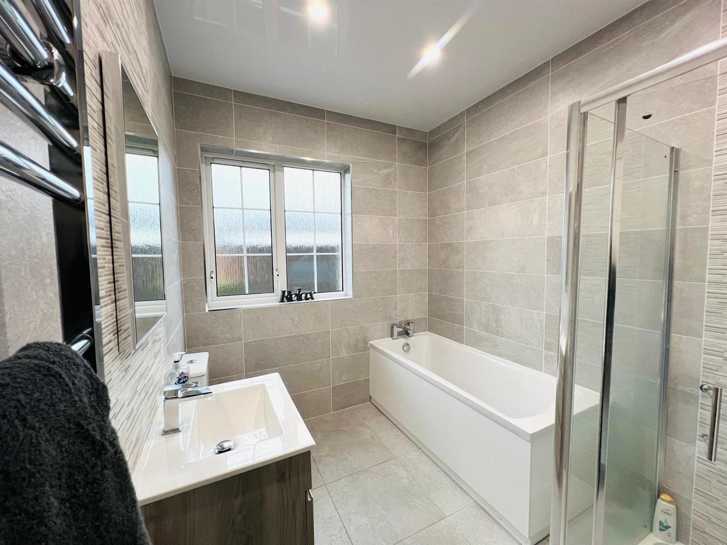 Comprising bath, walk in electric shower, whb set in vanity unit, wc, fully tiled walls and floor, recessed lighting, chrome radiator.