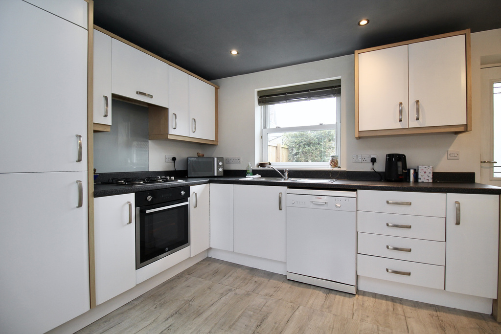 - Well-appointed kitchen fitted with a range of wall, base and drawer units, incorporating an integrated fridge/freezer, built-in oven and hob, with space for a dishwasher.