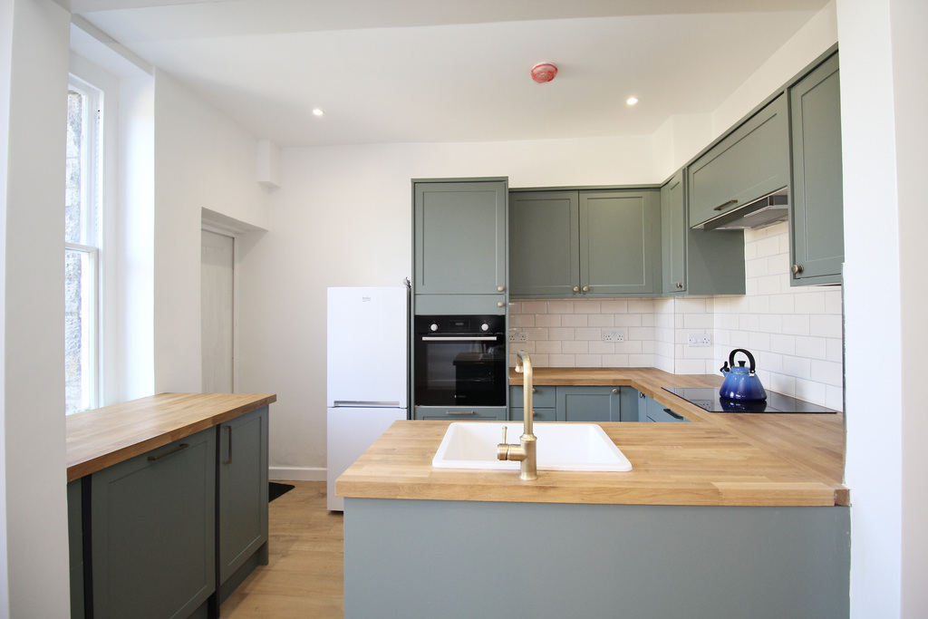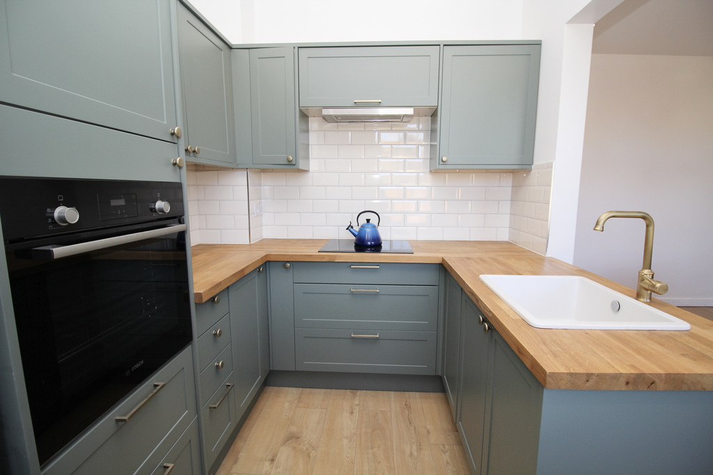 - Stylish, well-appointed kitchen with shaker-style wall, base and drawer units, integrated oven and hob, dishwasher, and space for a freestanding fridge/freezer.