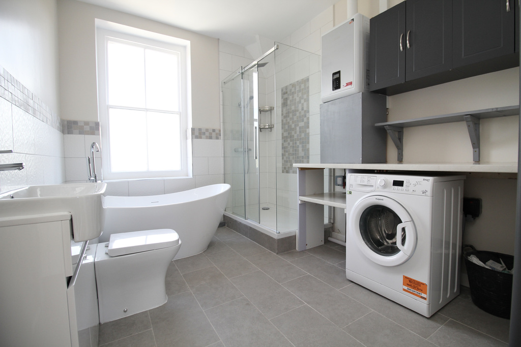 - The bathroom features a sleek, contemporary design with an elegant freestanding bath, large walk-in shower, integrated laundry area, vanity basin and WC, all complemented by modern tiling.