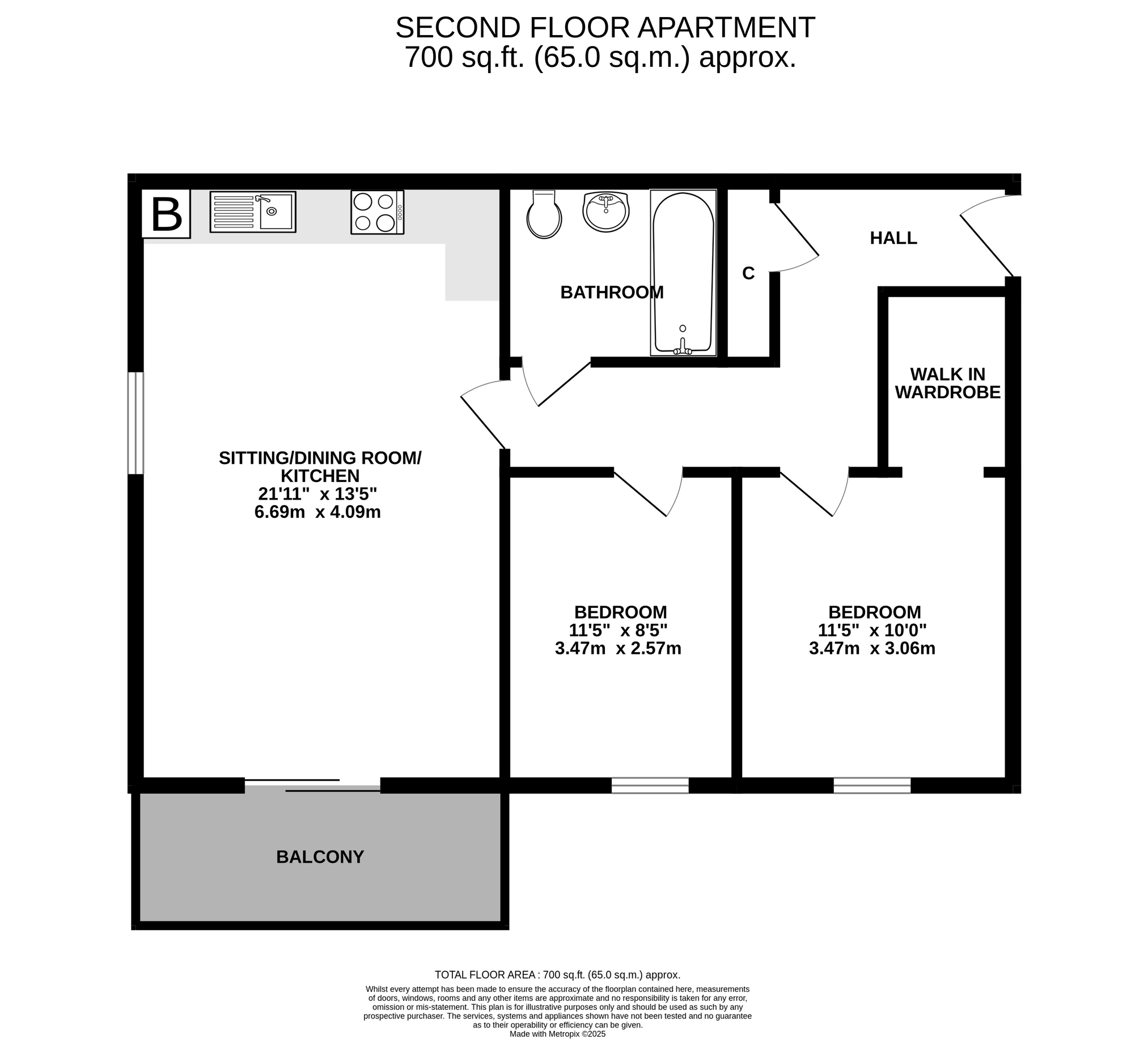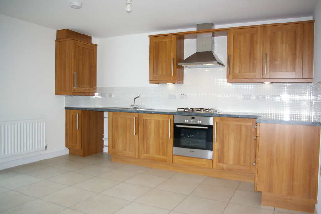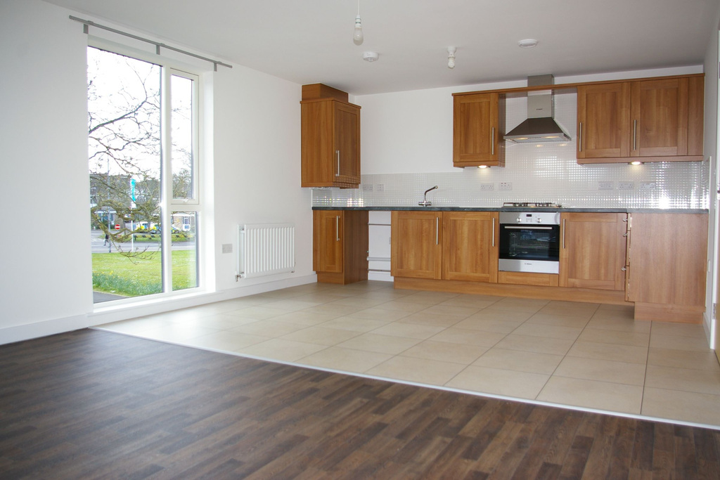 - The open plan kitchen/living/dining room has a light and airy feel with a modern kitchen at one end and sliding doors opening onto a double width balcony at the other.