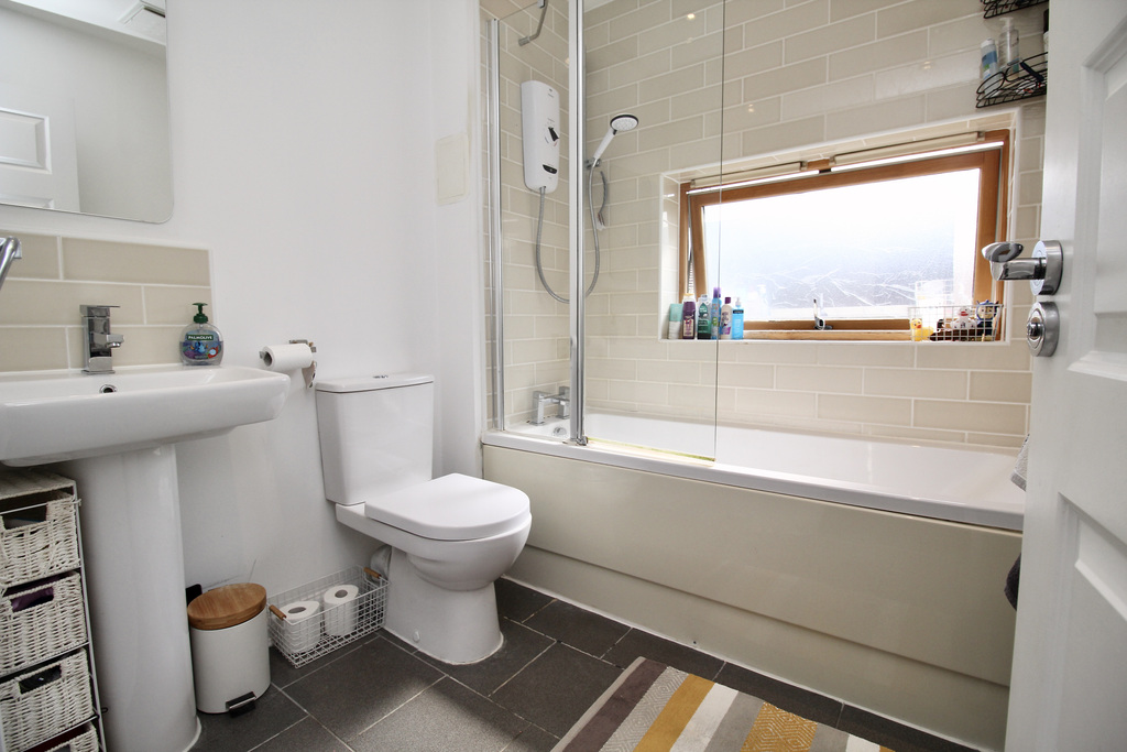 - Contemporary family bathroom comprising bath with shower over, wash basin and WC.