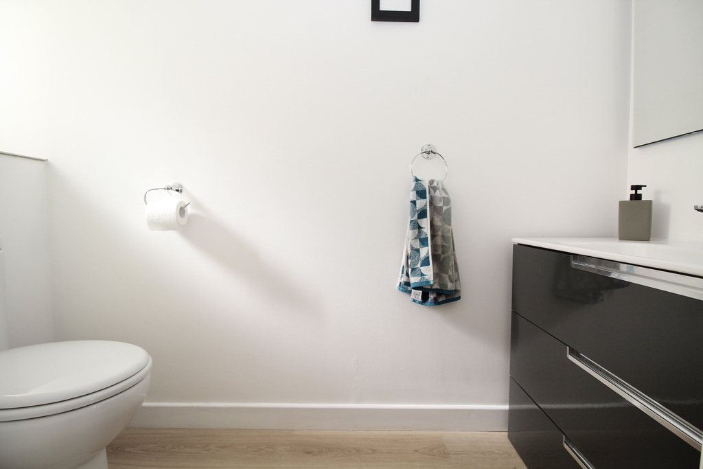 - Modern bathroom comprising panelled bath with shower over, wash basin , WC and finished off with a heated chrome towel rail.