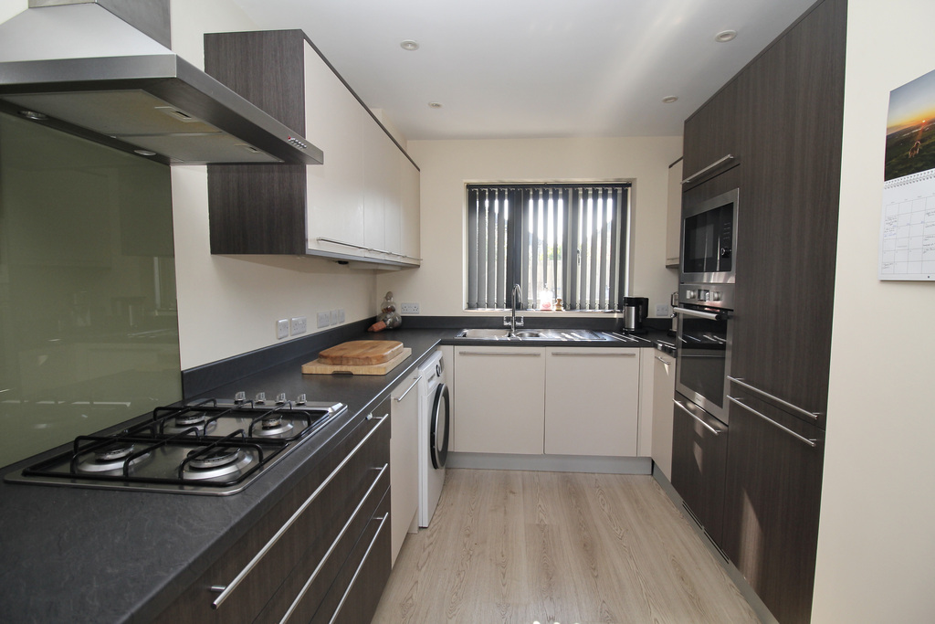 - Contemporary kitchen fitted with well-appointed wall, base and drawer units, integrated oven, hob, fridge/freezer and dishwasher, with a breakfast bar and ample worktop space.
