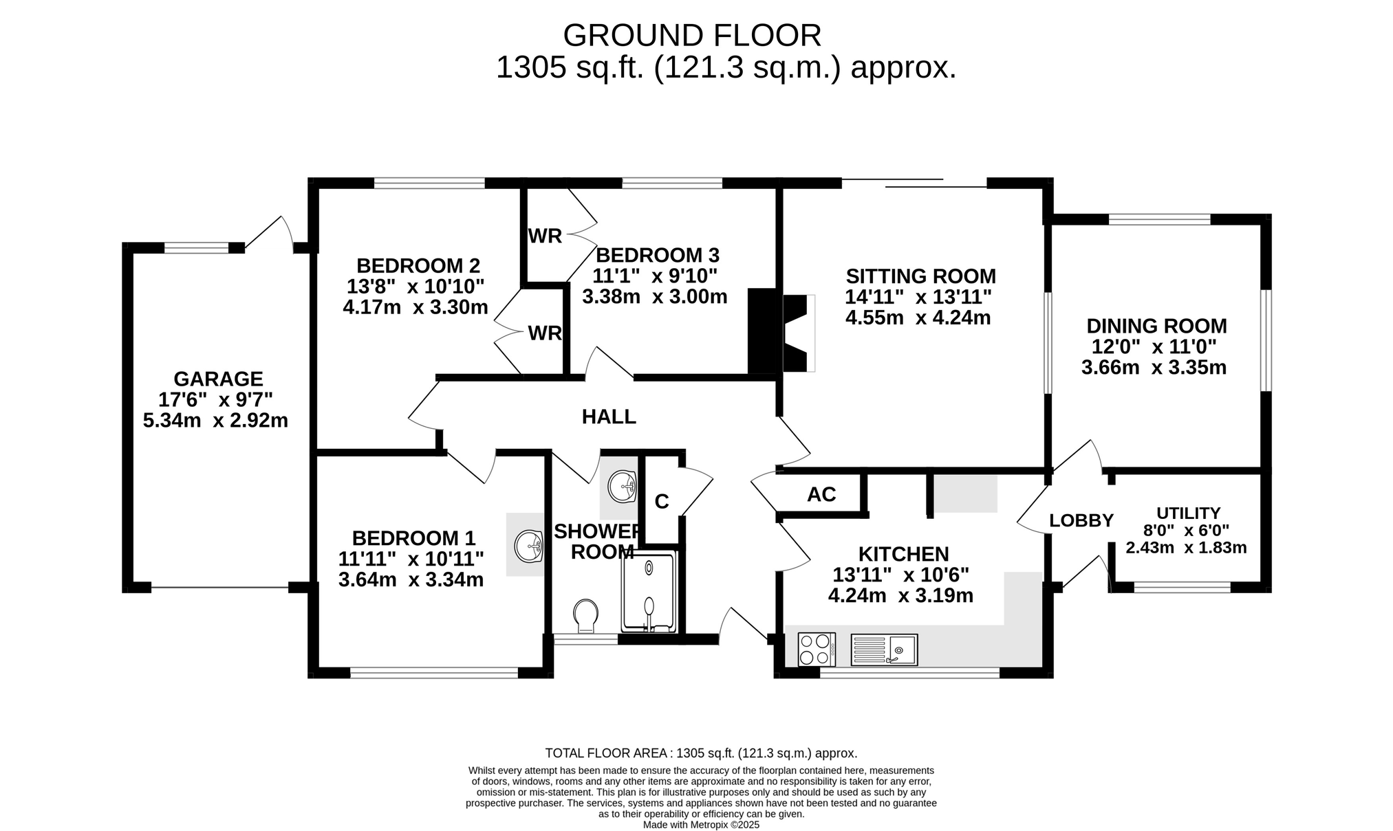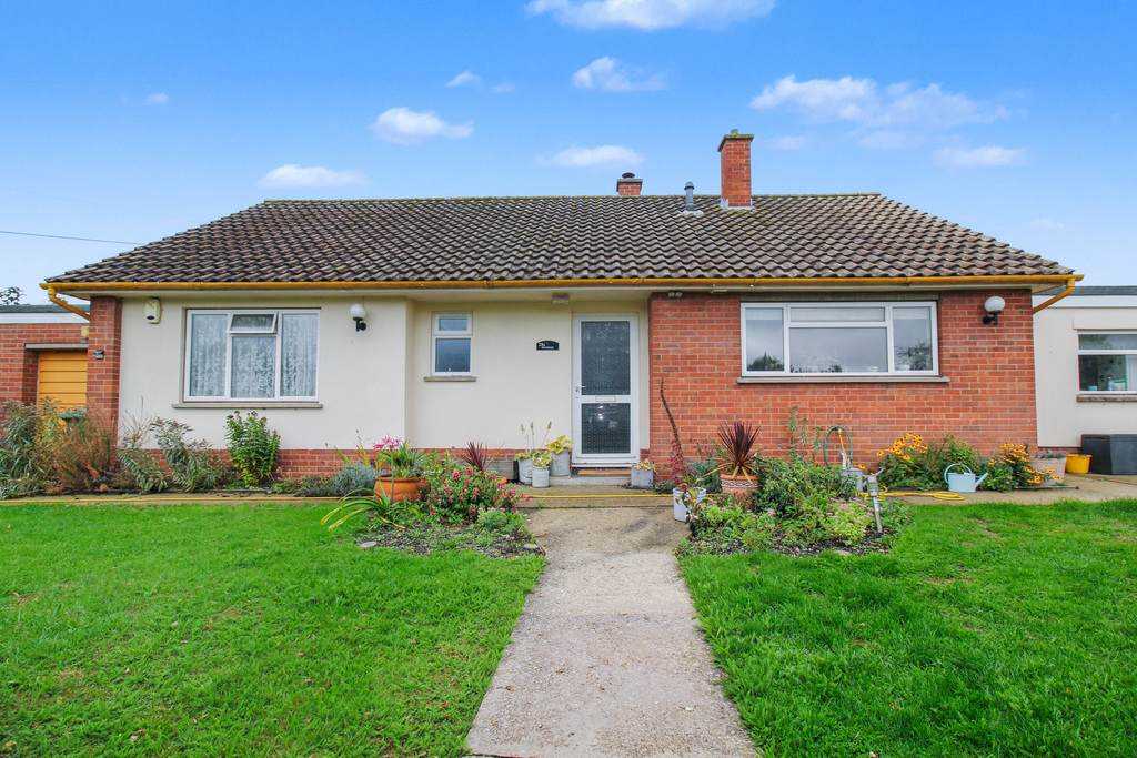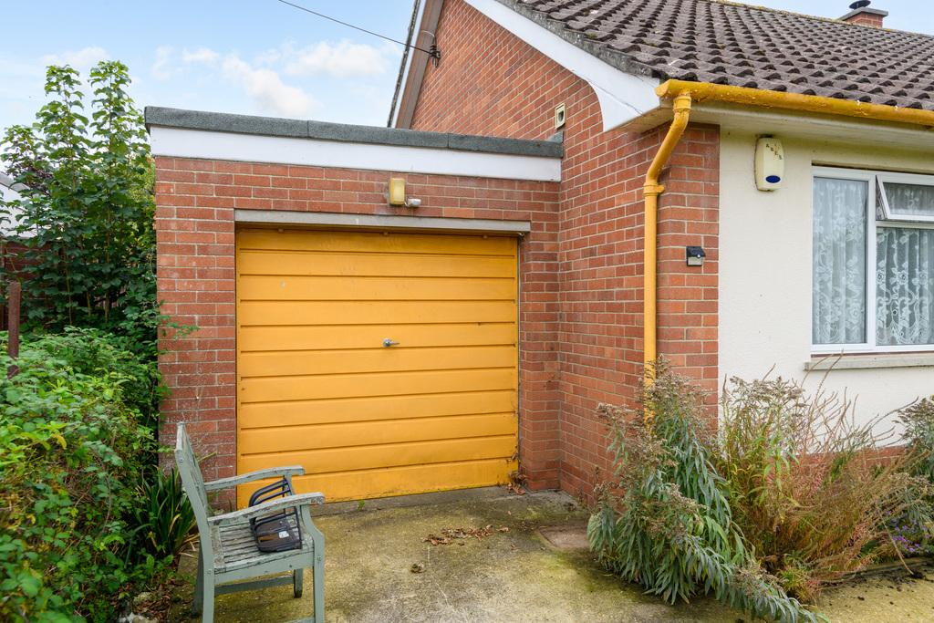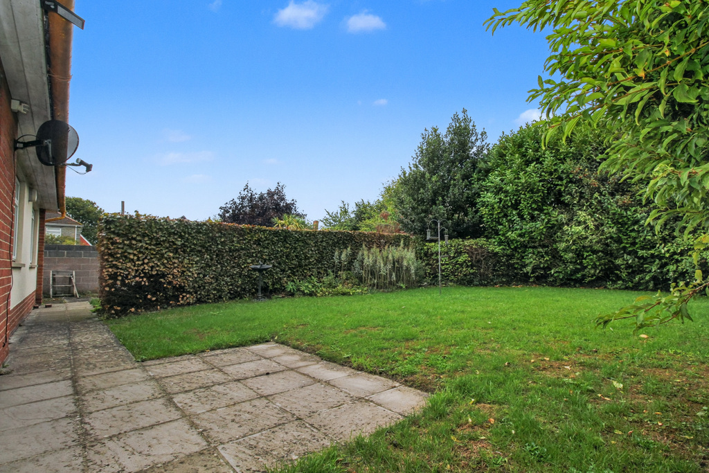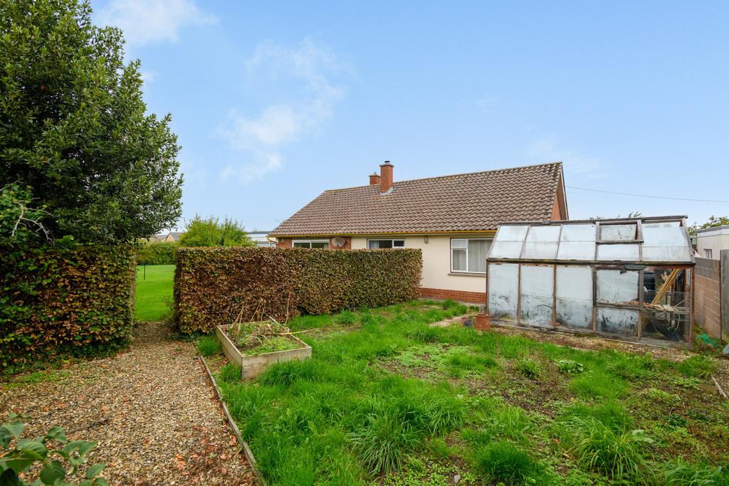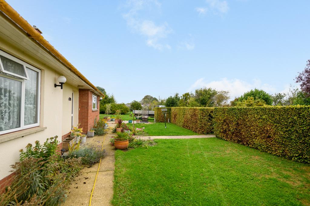 - To the front, a driveway provides parking and leads to the garage, complemented by a lawn bordered with mature hedgerow.